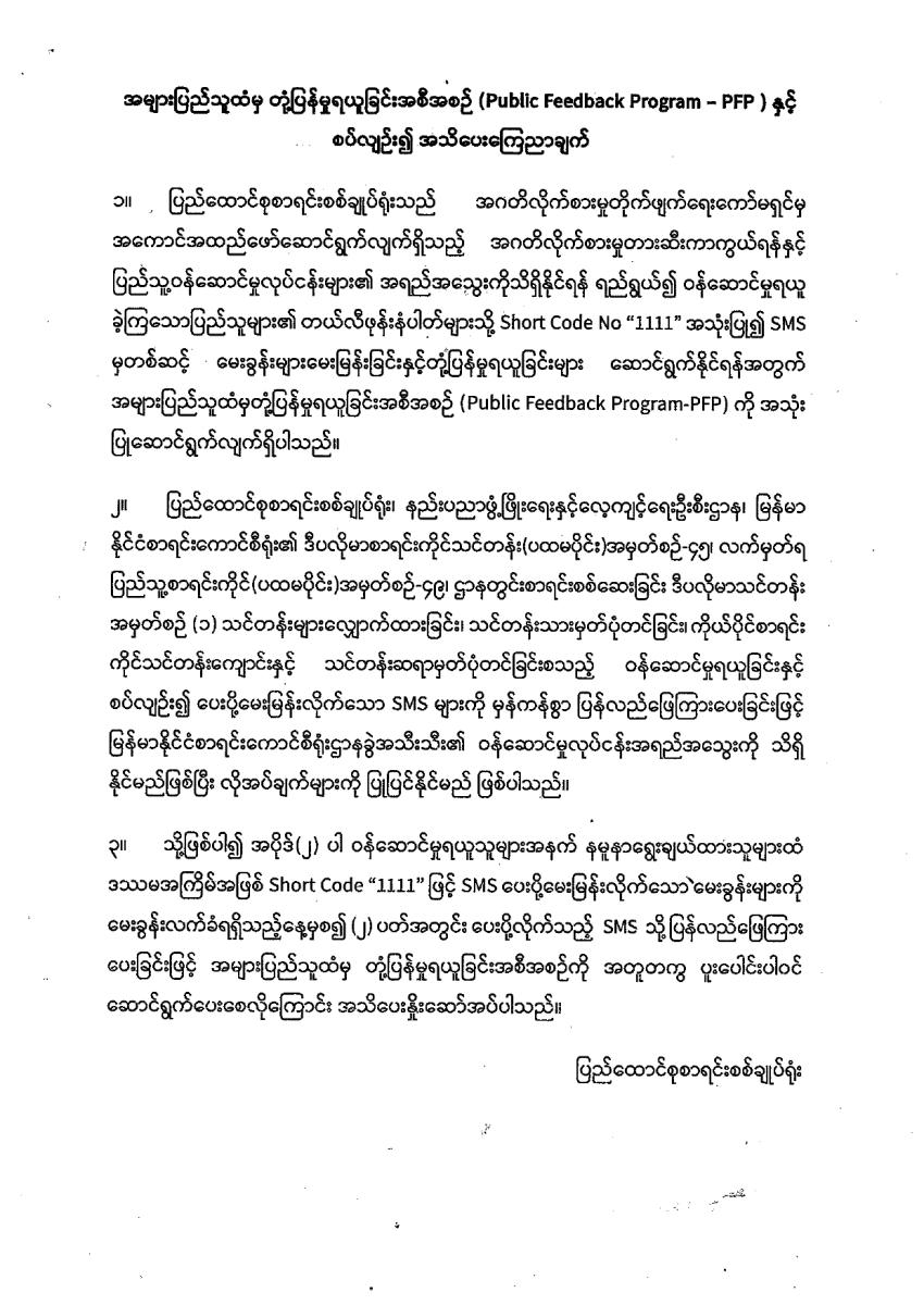 အများပြည်သူထံမှ တုံ့ပြန်မှုရယူခြင်း၊အစီအစဉ် (Public Feedback Program – PFP) နှင့် စပ်လျဉ်း၍ အသိပေးကြေညာချက်