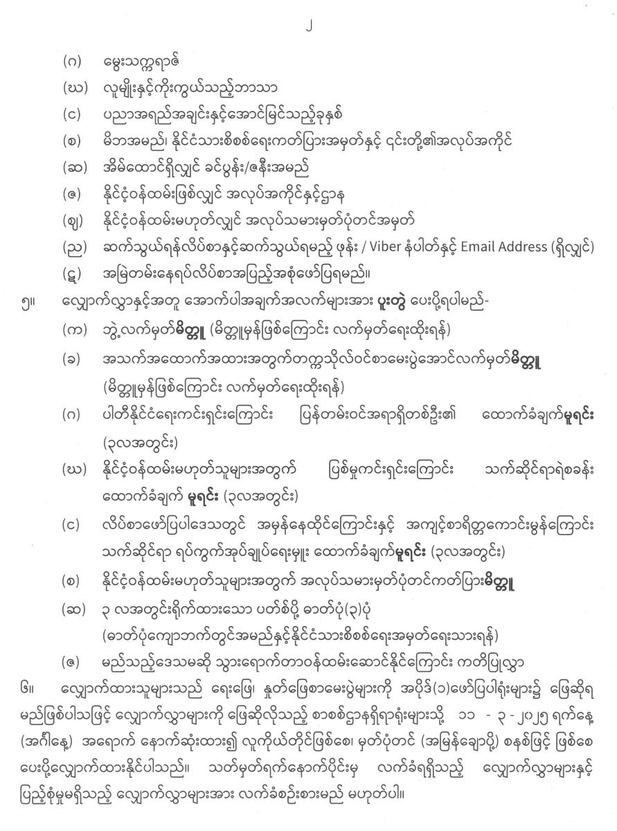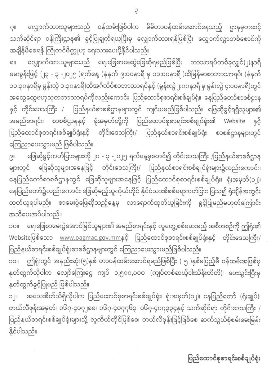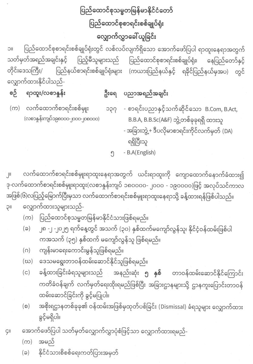 ပြည်ထောင်စုစာရင်းစစ်ချုပ်ရုံးတွင် လစ်လပ်လျက်ရှိသော လက်ထောက်စာရင်းစစ်မှူး (လစာနှုန်း ကျပ် ၁၉၈၀၀၀-၂၀၀၀-၂၀၈၀၀၀) အတွက် လျှောက်လွှာခေါ်ယူခြင်း