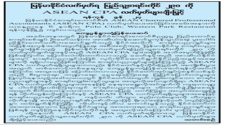 မြန်မာနိုင်ငံလက်မှတ်ရ ပြည်သူ့စာရင်းကိုင် ၂၉၀ ကို ASEAN CPA လက်မှတ်များချီးမြှင့်