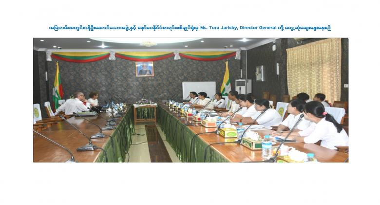 အမြဲတမ်းအတွင်းဝန်ဉီးဆောင်သော စီမံခန့်ခွဲရေးပိုင်းမှ တာဝန်ရှိသူများနှင့် Ms. Tora Jarlsby တို့သည် နံနက် ၁၀:၃၀ နာရီမှ ၁၂:၀၀ နာရီအထိ တစ်ကြိမ်၊ နေ့လယ် ၁:၃၀ နာရီမှ ၃:၀၀ နာရီအထိ တစ်ကြိမ် ဤရုံး အစည်းအဝေးခန်း၌ တွေ့ဆုံခဲ့ကြရာတွင် Ms. Tora Jarlsby ကနော်ဝေနိုင်ငံစာရင်းစစ်ချုပ်ရုံး၏ ဖွဲ့စည်းပုံဆိုင်ရာ ပြောင်းလဲမှုများ၊ စစ်ဆေးရေးနည်းလမ်းသစ်များ၊ ဆောင်ရွက်နေသည့်အစီအစဉ်များနှင့် ခေတ်မီပြောင်းလဲတိုးတက်နေမှုများနှင့်စပ်လျဉ်းသော အတွေ့အကြုံများကိုမျှဝေပြီး ပြည်ထောင်စု စာရင်းစစ်ချုပ်ရုံး၏ ဥပဒေဆိုင်ရာမူဘောင်၊ ဖွဲ့စည်းပုံနှင့် စစ်ဆေးရေးစွမ်းဆောင်ရည် တိုးတက်မြင့်မားစေရေးတို့အတွက် ပြောင်းလဲရေးလုပ်ငန်းစဉ်များနှင့် တွေ့ကြုံရမည့်စိန်ခေါ်မှုများကို ဆွေးနွေးခဲ့ကြပါသည်။