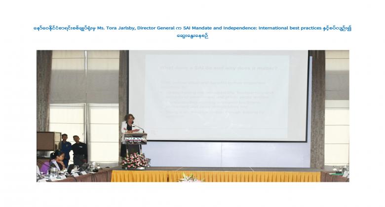 ပထမဉီးစွာ ပြည်ထောင်စုစာရင်းစစ်ချုပ်က အဖွင့်အမှာစကား ပြောကြားပါသည်။ ထို့နောက် နော်ဝေနိုင်ငံစာရင်းစစ်ချုပ်ရုံးမှ Director General ဖြစ်သူ Ms. Tora Jarlsby က SAI Mandate and Independence: International Best Practices နှင့်စပ်လျဉ်း၍လည်းကောင်း၊ ပြည်ထောင်စုစာရင်းစစ်ချုပ်ရုံးမှ အမြဲတမ်းအတွင်းဝန် ဒေါ်နိုင်သက်ဉီးက Practices of Union Auditor General Office and Challenges နှင့်စပ်လျဉ်း၍လည်းကောင်း၊ My Governance Project မှ Senior Legal Consultant ဖြစ်သူ ဒေါက်တာဒေါ်ခင်မာရီက Comparison between Myanmar Legal Framework and International Standards of Supreme Audit Institutions (ISSAI) နှင့်စပ်လျဉ်း၍လည်း ကောင်းဆွေးနွေးကြရာ တက်ရောက်လာသူများက အကြံပြုဆွေးနွေးခြင်း၊ သိရှိလိုသည်များ မေးမြန်းမှုကို ပြန်လည်ဖြေကြားခြင်းများ ဆောင်ရွက်ခဲ့ကြပါသည်။