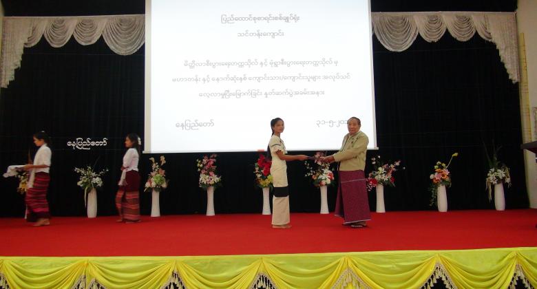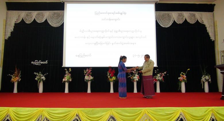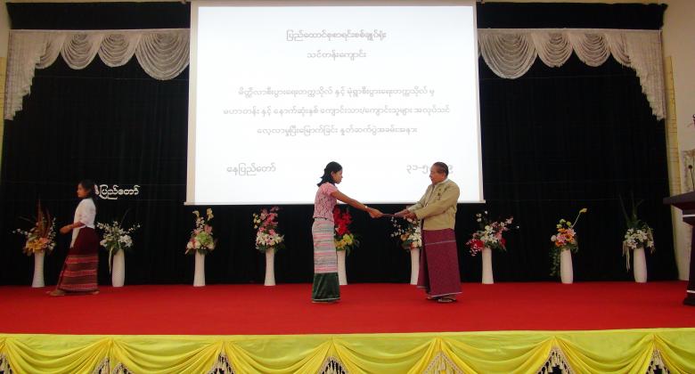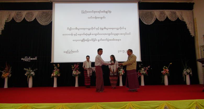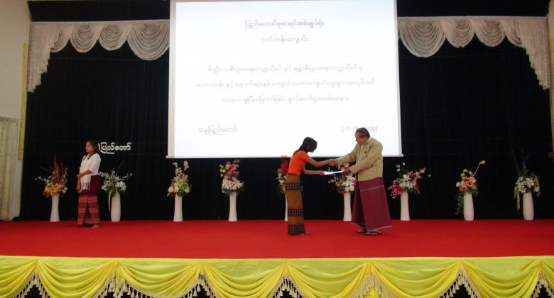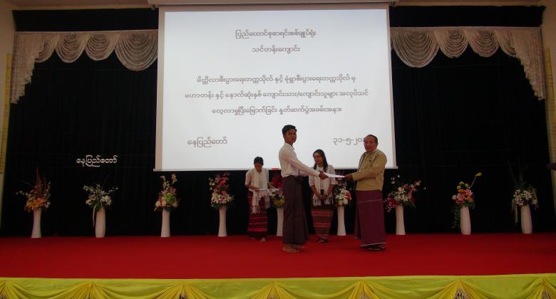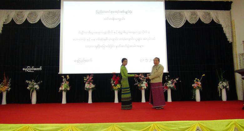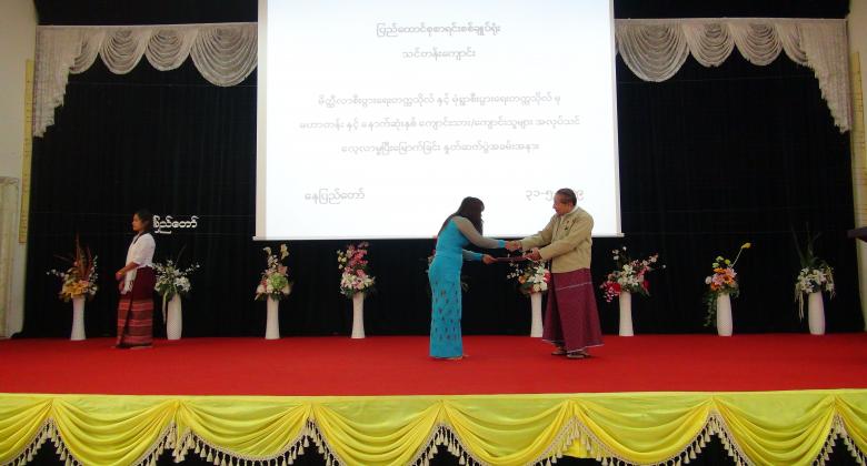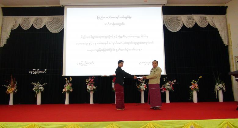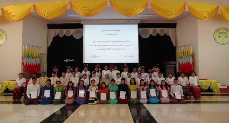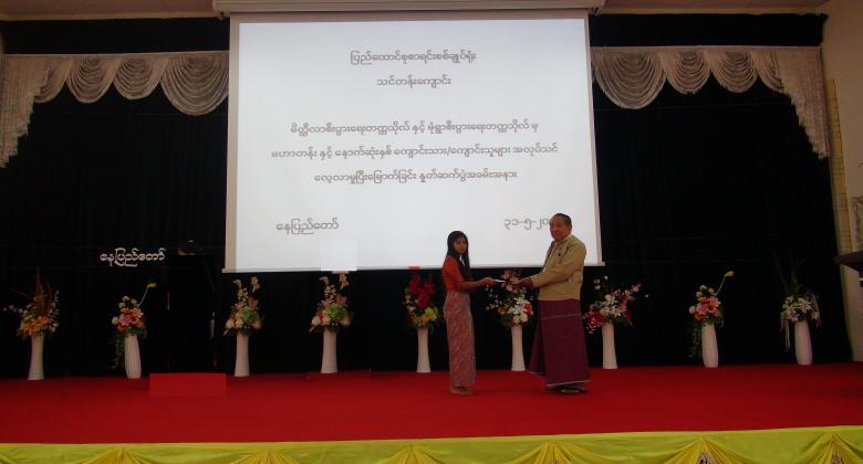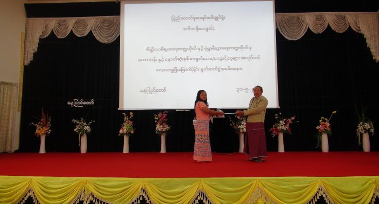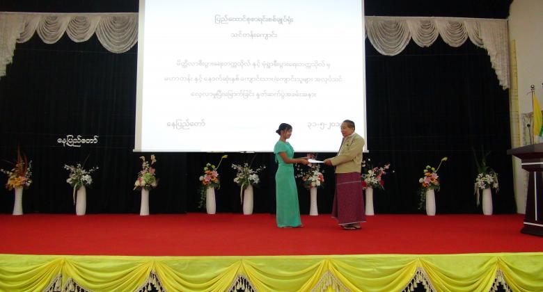 ၄။ ပြည်ထောင်စုစာရင်းစစ်ချုပ်မှ အလုပ်သင်မောင်မယ်များအား အလုပ်သင်ပြီးမြောက်ကြောင်း အသိမှတ်ပြုလက်မှတ် ချီးမြှင့်ပေးအပ်ခဲ့ပြီး အခမ်းအနားကို မွန်းလွဲ ( ၂ : ၀၀ ) နာရီတွင် ရုပ်သိမ်းခဲ့ပါသည်။
