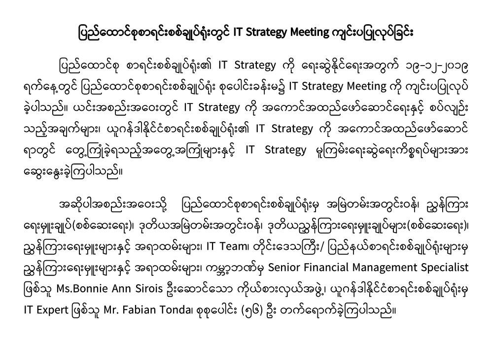 ပြည်ထောင်စုစာရင်းစစ်ချုပ်ရုံးတွင် IT Strategy Meeting ကျင်းပပြုလုပ်ခြင်း