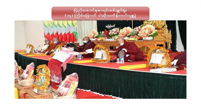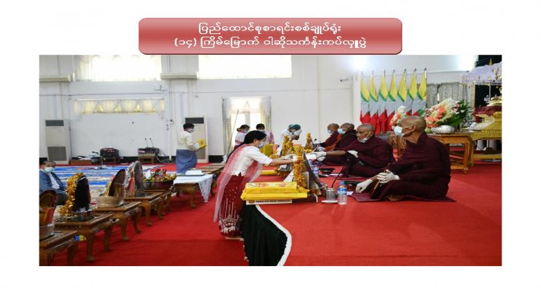 ၂။ အဆိုပါဝါဆိုသင်္ကန်းဆက်ကပ်လှူဒါန်းပွဲသို့ ပျဉ်းမနားမြို့၊ ဘုရားကြီးကျောင်းတိုက်နှင့် ရတနာဘုမ္မိသာရကျောင်းတိုက်များရှိ သံဃာတော်အရှင်သူမြတ်များ ကြွရောက်တော်မူကြပြီး ပြည်ထောင်စုစာရင်းစစ်ချုပ် ဦးမော်သန်းနှင့် ပြည်ထောင်စုစာရင်းစစ်ချုပ်ရုံး ဝန်ထမ်းများက ဝါဆိုသင်္ကန်းနှင့်တကွ လှူဖွယ်ပစ္စည်းအစုစုတို့ကို ဆက်ကပ်လှူဒါန်းကြပါသည်။