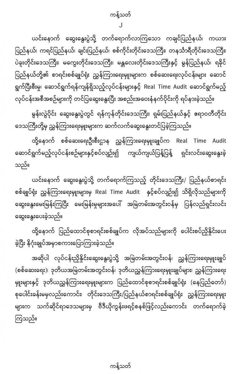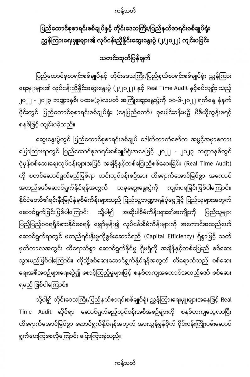 ၁၀-၆-၂၀၂၂ ရက်နေ့တွင် ပြည်ထောင်စုစာရင်းစစ်ချုပ်နှင့် တိုင်းဒေသကြီး/ပြည်နယ်စာရင်းစစ်ချုပ်ရုံး ညွှန်ကြားရေးမှူးများ၏ လုပ်ငန်းညှိနှိုင်းဆွေးနွေးပွဲ (၂/၂၀၂၂) ကျင်းပခြင်း