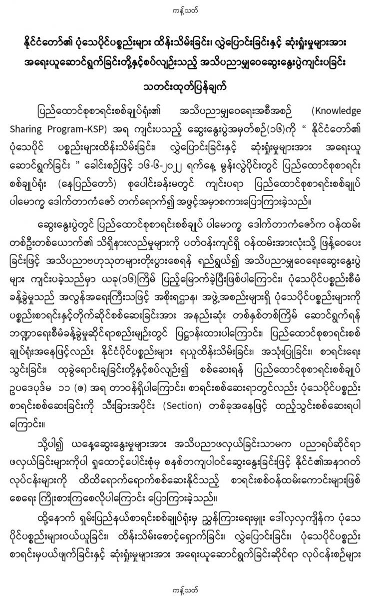 ၁၆-၆-၂၀၂၂ ရက်နေ့တွင် နိုင်ငံတော်၏ ပုံသေပိုင်ပစ္စည်းများ ထိန်းသိမ်းခြင်း၊ လွှဲပြောင်းခြင်းနှင့် ဆုံးရှုံးမှုများအား အရေးယူဆောင်ရွက်ခြင်းတို့နှင့်စပ်လျဉ်းသည့် အသိပညာမျှဝေဆွေးနွေးပွဲကျင်းပခြင်း