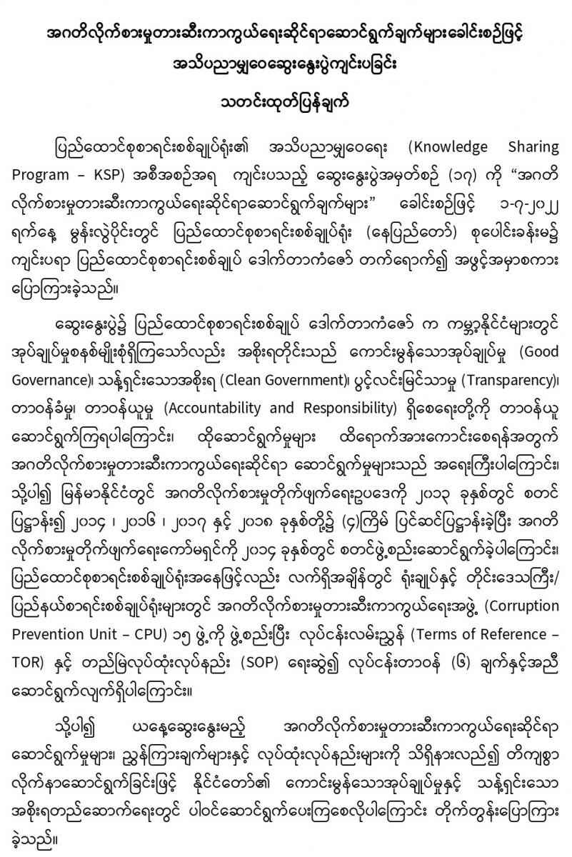၁-၇-၂၀၂၂ ရက်နေ့တွင် အဂတိလိုက်စားမှုတားဆီးကာကွယ်ရေးဆိုင်ရာဆောင်ရွက်ချက်များခေါင်းစဉ်ဖြင့် အသိပညာမျှဝေဆွေးနွေးပွဲကျင်းပခြင်း