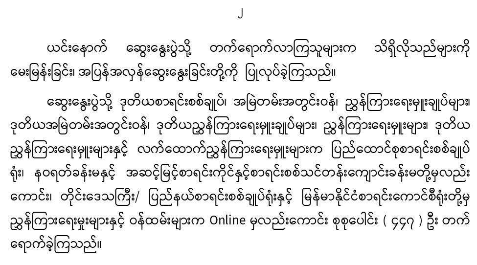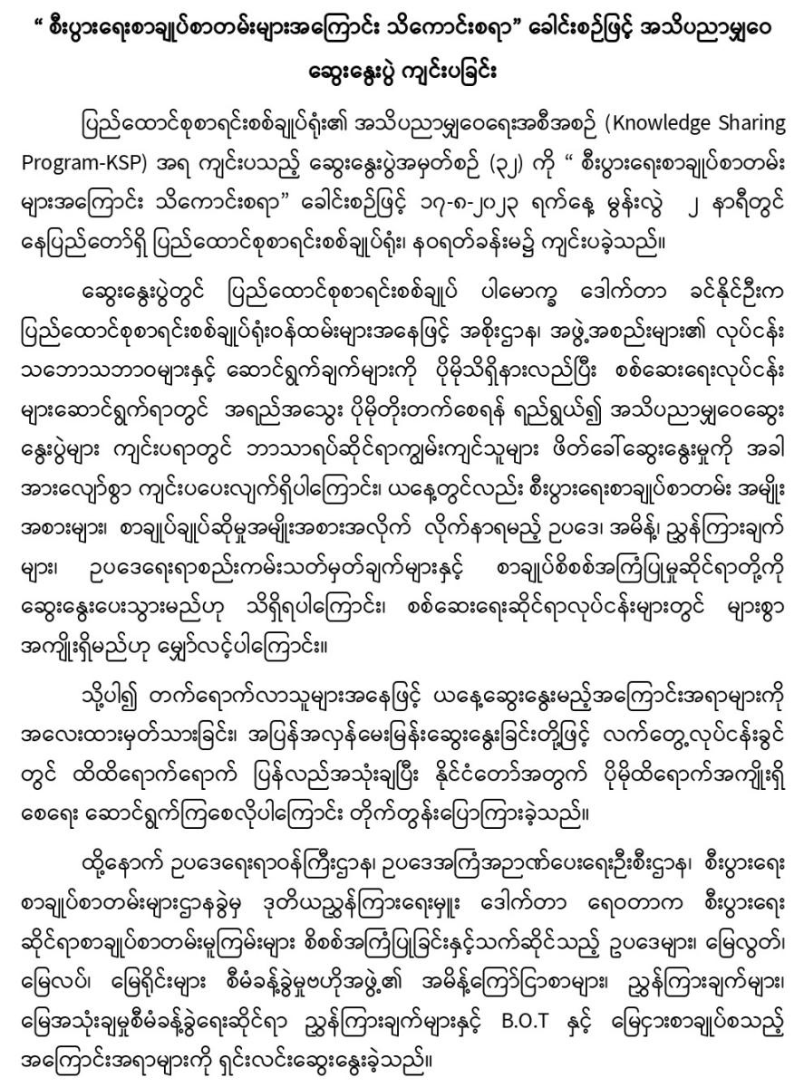 ၁၇-၈-၂၀၂၃ ရက်နေ့တွင် “ စီးပွားရေးစာချုပ်စာတမ်းများအကြောင်း သိကောင်းစရာ” ခေါင်းစဉ်ဖြင့် အသိပညာမျှဝေ ဆွေးနွေးပွဲ ကျင်းပခြင်း