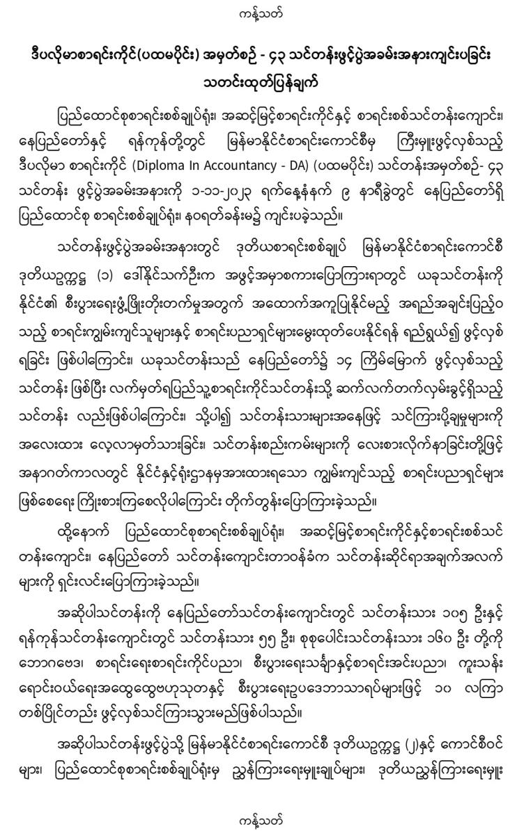 ၁-၁၁-၂၀၂၃ ရက်နေ့တွင် ဒီပလိုမာစာရင်းကိုင်(ပထမပိုင်း) အမှတ်စဉ် - ၄၃ သင်တန်းဖွင့်ပွဲအခမ်းအနားကျင်းပခြင်း သတင်းထုတ်ပြန်ချက်
