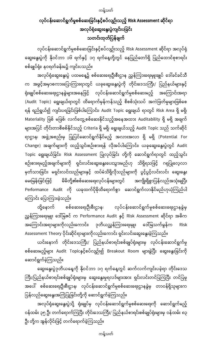 ၁၆-၁၁-၂၀၂၃ ရက်နေ့နှင့် ၁၇-၁၁-၂၀၂၃ ရက်နေ့တို့တွင် လုပ်ငန်းဆောင်ရွက်မှုစစ်ဆေးခြင်းနှင့်စပ်လျဉ်းသည့် Risk Assessment ဆိုင်ရာ အလုပ်ရုံဆွေးနွေးပွဲကျင်းပခြင်း