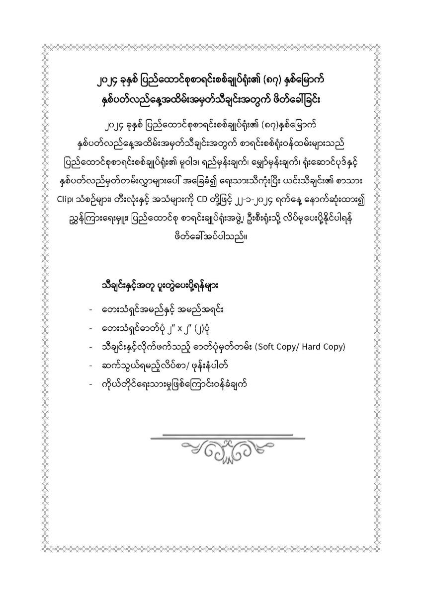 ၂၀၂၄ ခုနှစ် ပြည်ထောင်စုစာရင်းစစ်ချုပ်ရုံး၏ (၈၇) နှစ်မြောက် နှစ်ပတ်လည်နေ့အထိမ်းအမှတ်သီချင်းအတွက် ဖိတ်ခေါ်ခြင်း
