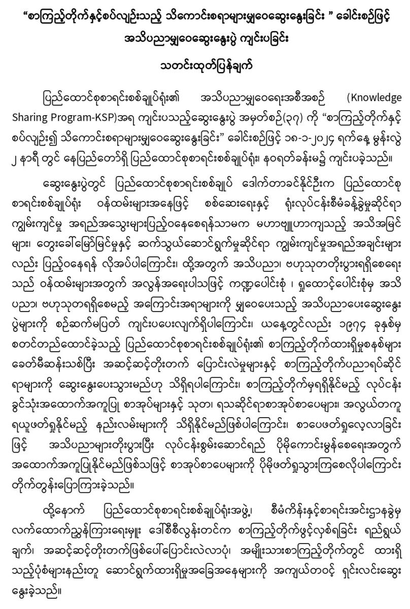 ၁၈-၁-၂၀၂၄ ရက်နေ့တွင် “စာကြည့်တိုက်နှင့်စပ်လျဉ်းသည့် သိကောင်းစရာများမျှဝေဆွေးနွေးခြင်း ” ခေါင်းစဉ်ဖြင့် အသိပညာမျှဝေဆွေးနွေးပွဲ ကျင်းပခြင်း