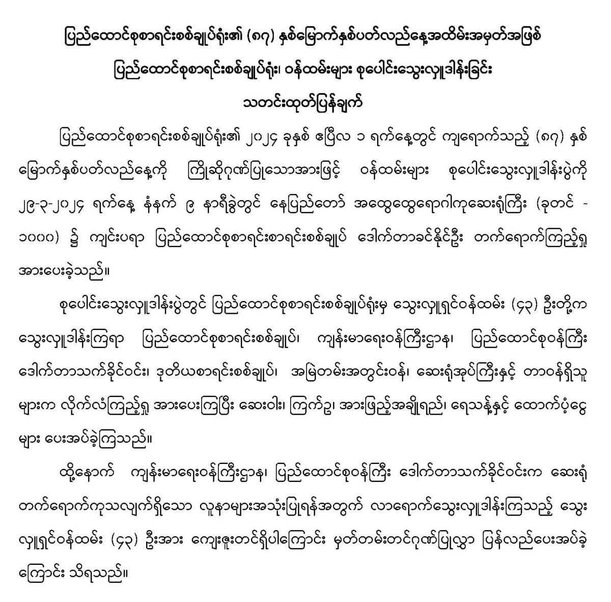 ၂၉-၃-၂၀၂၄ ရက်နေ့တွင် ပြည်ထောင်စုစာရင်းစစ်ချုပ်ရုံး၏ (၈၇) နှစ်မြောက်နှစ်ပတ်လည်နေ့အထိမ်းအမှတ်အဖြစ် ပြည်ထောင်စုစာရင်းစစ်ချုပ်ရုံး၊ ဝန်ထမ်းများ စုပေါင်းသွေးလှူဒါန်းခြင်း