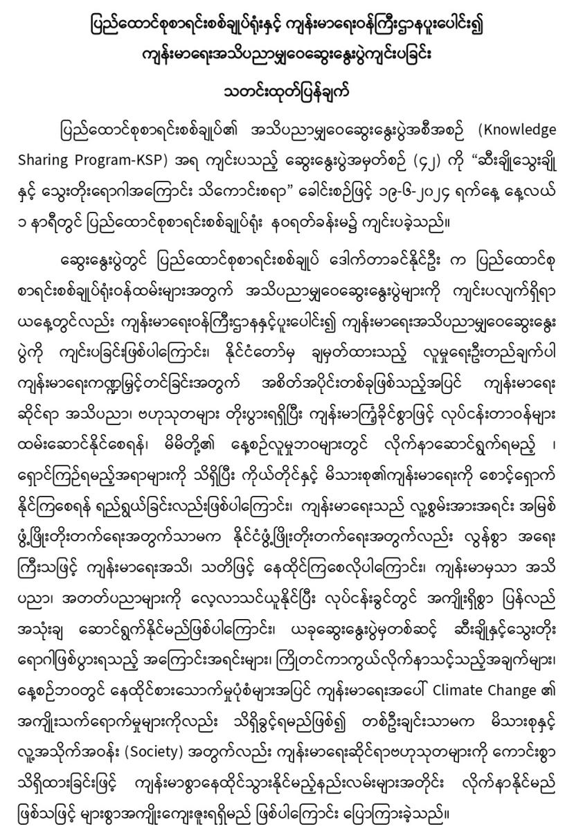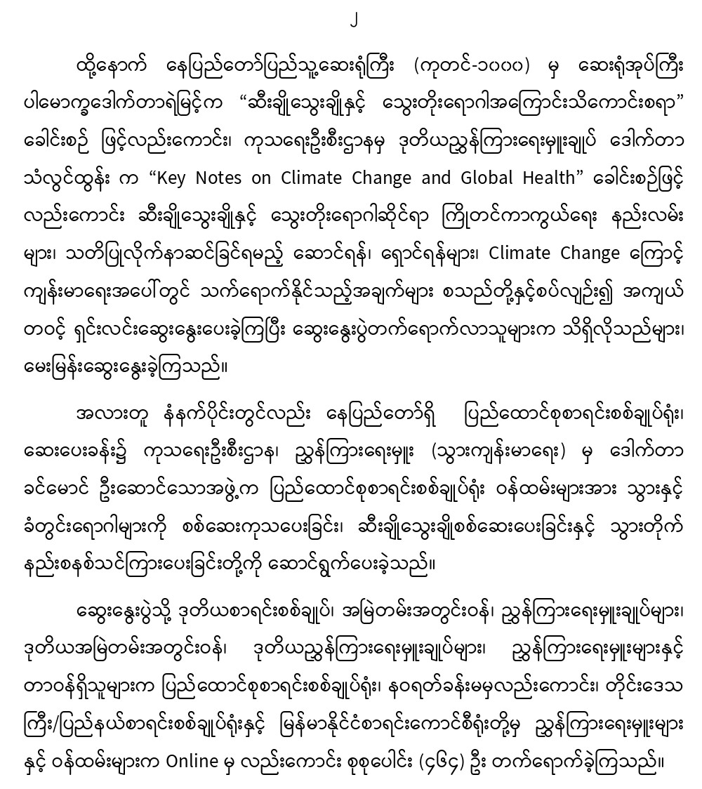 ၁၉-၆-၂၀၂၄ ရက်နေ့တွင် ပြည်ထောင်စုစာရင်းစစ်ချုပ်ရုံးနှင့် ကျန်းမာရေးဝန်ကြီးဌာနပူးပေါင်း၍ ကျန်းမာရေးအသိပညာမျှဝေဆွေးနွေးပွဲကျင်းပခြင်း