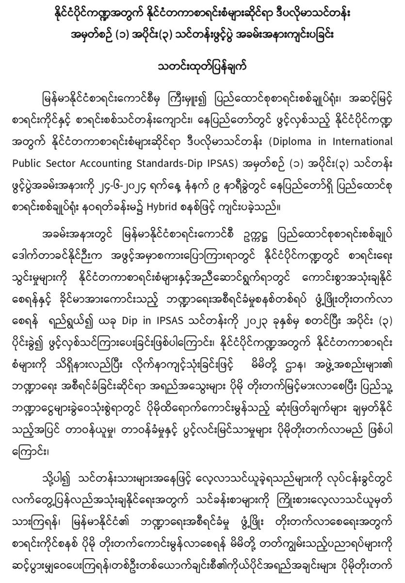 ၂၄-၆-၂၀၂၄ ရက်နေ့တွင် နိုင်ငံပိုင်ကဏ္ဍအတွက် နိုင်ငံတကာစာရင်းစံများဆိုင်ရာ ဒီပလိုမာသင်တန်း အမှတ်စဉ် (၁) အပိုင်း(၃) သင်တန်းဖွင့်ပွဲ အခမ်းအနားကျင်းပခြင်း