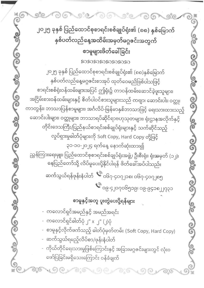 ၂၀၂၅ ခုနှစ် ပြည်ထောင်စုစာရင်းစစ်ချုပ်ရုံး၏ (၈၈) နှစ်မြောက် နှစ်ပတ်လည်နေ့အထိမ်းအမှတ် မဂ္ဂဇင်းအတွက် စာမူများဖိတ်ခေါ်ခြင်း
