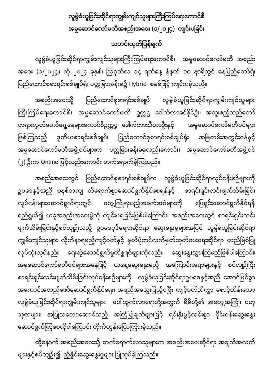 ၁၄-၈-၂၀၂၄ ရက်နေ့တွင် လူမွဲခံယူခြင်းဆိုင်ရာကျွမ်းကျင်သူများကြီးကြပ်ရေးကောင်စီ အမှုဆောင်ကော်မတီအစည်းအဝေး (၁/၂၀၂၄) ကျင်းပခြင်း