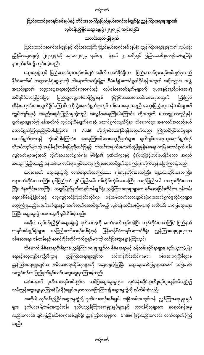 ပြည်ထောင်စုစာရင်းစစ်ချုပ်နှင့် တိုင်းဒေသကြီး/ပြည်နယ်စာရင်းစစ်ချုပ်ရုံး ညွှန်ကြားရေးမှူးများ၏ လုပ်ငန်းညှိနှိုင်းဆွေးနွေးပွဲ (၂/၂၀၂၄) ကျင်းပခြင်း