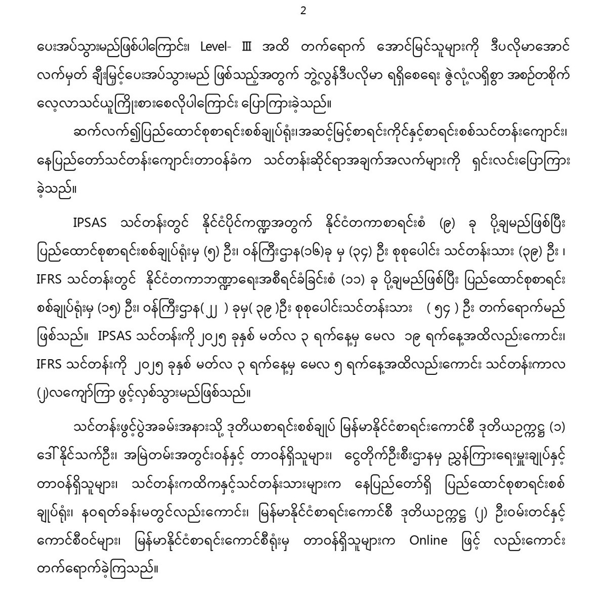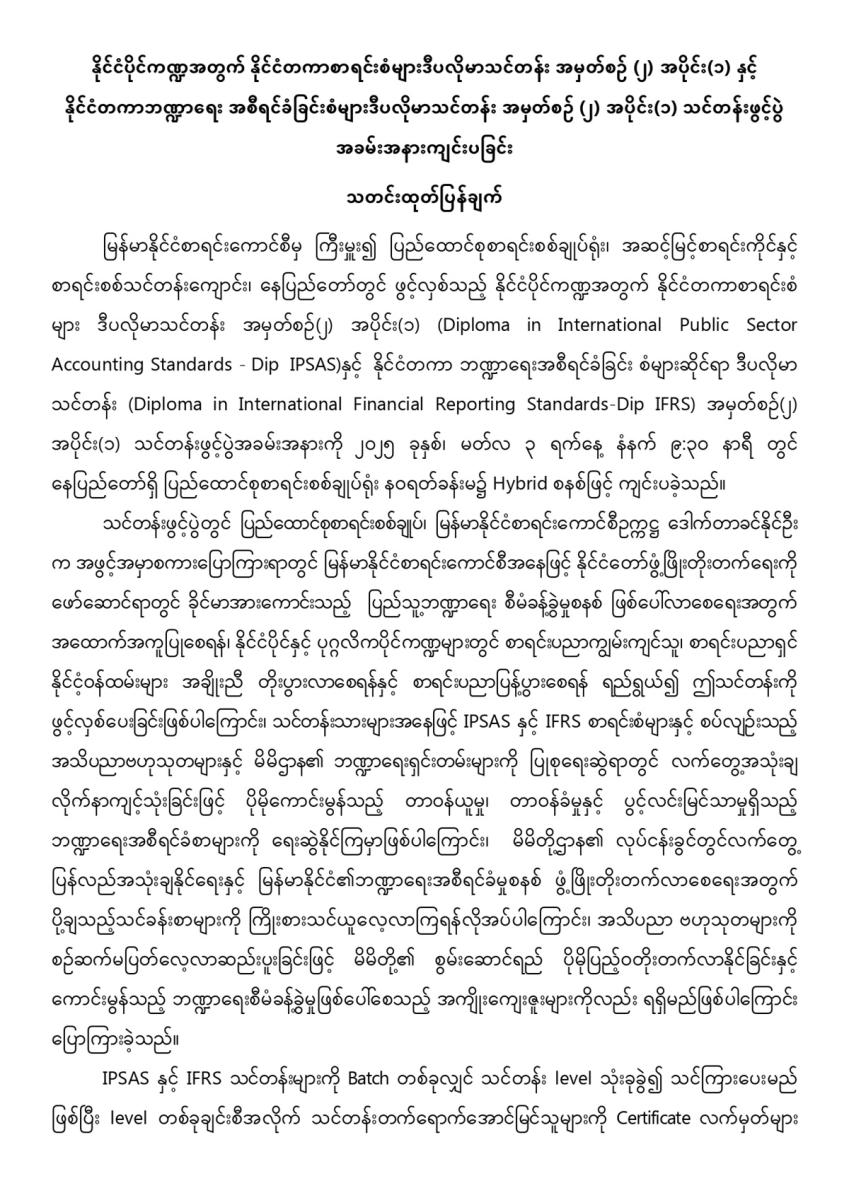 နိုင်ငံပိုင်ကဏ္ဍအတွက် နိုင်ငံတကာစာရင်းစံများဒီပလိုမာသင်တန်း အမှတ်စဉ် (၂) အပိုင်း(၁) နှင့် နိုင်ငံတကာဘဏ္ဍာရေး အစီရင်ခံခြင်းစံများဒီပလိုမာသင်တန်း အမှတ်စဉ် (၂) အပိုင်း(၁) သင်တန်းဖွင့်ပွဲ အခမ်းအနားကျင်းပခြင်း