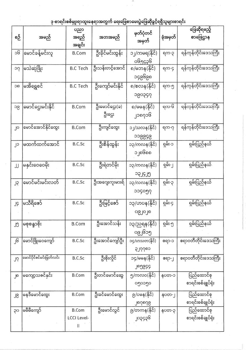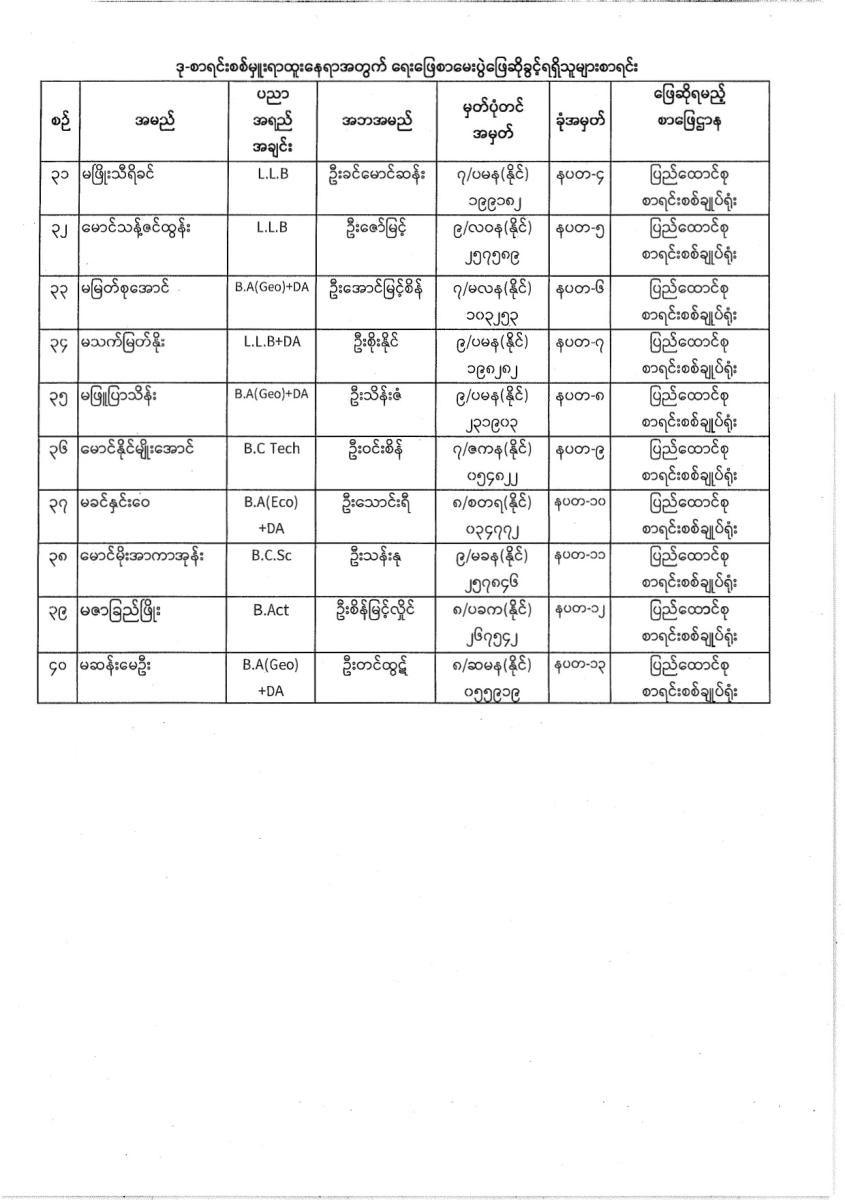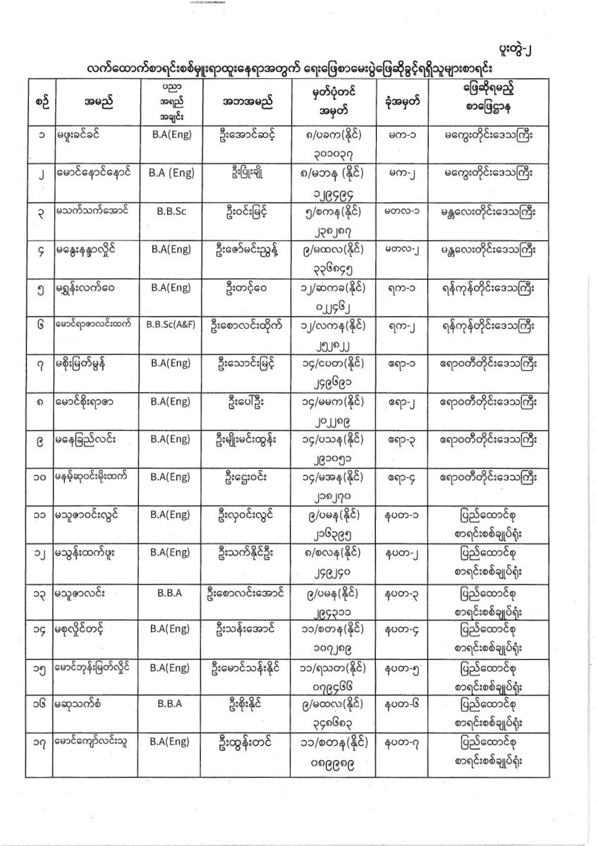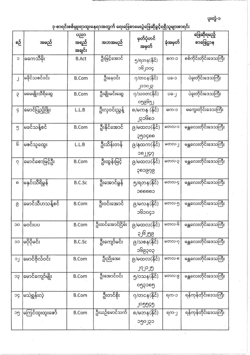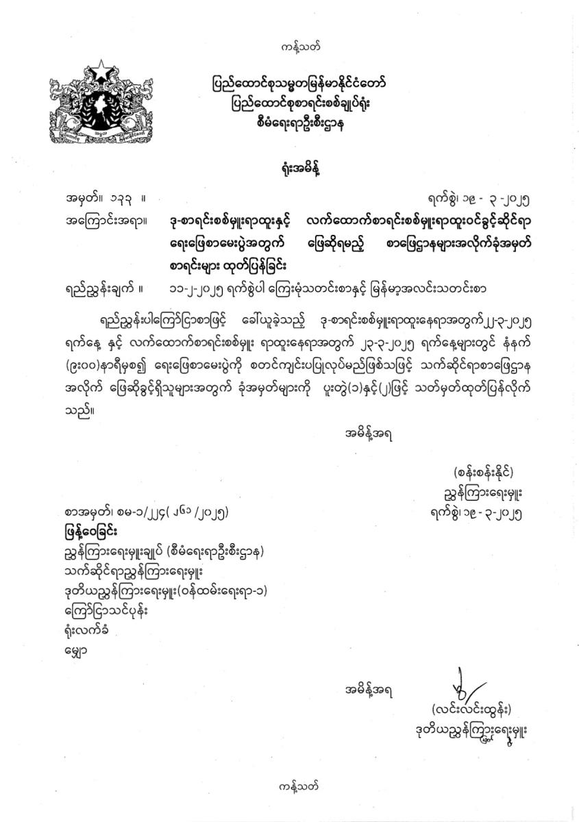 ဒု-စာရင်းစစ်မှူးရာထူးနှင့် လက်ထောက်စာရင်းစစ်မှူးရာထူးဝင်ခွင့်ဆိုင်ရာ ရေးဖြေစာမေးပွဲအတွက် ဖြေဆိုရမည့် စာဖြေဌာနများအလိုက်ခုံအမှတ်စာရင်းများ ထုတ်ပြန်ခြင်း