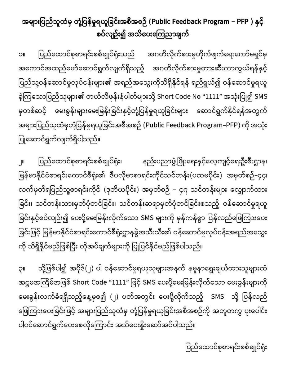 အများပြည်သူထံမှ တုံ့ပြန်မှုရယူခြင်းအစီအစဉ် (Public Feedback Program – PFP ) နှင့် စပ်လျဉ်း၍ အသိပေးကြေညာချက်