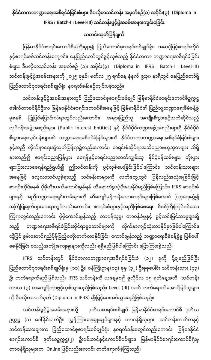 နိုင်ငံတကာဘဏ္ဍာရေးအစီရင်ခံခြင်းစံများ ဒီပလိုမာသင်တန်း အမှတ်စဉ်(၁) အပိုင်း(၃) (Diploma in IFRS ၊ Batch-I ၊ Level-III) သင်တန်းဖွင့်ပွဲအခမ်းအနားကျင်းပခြင်း