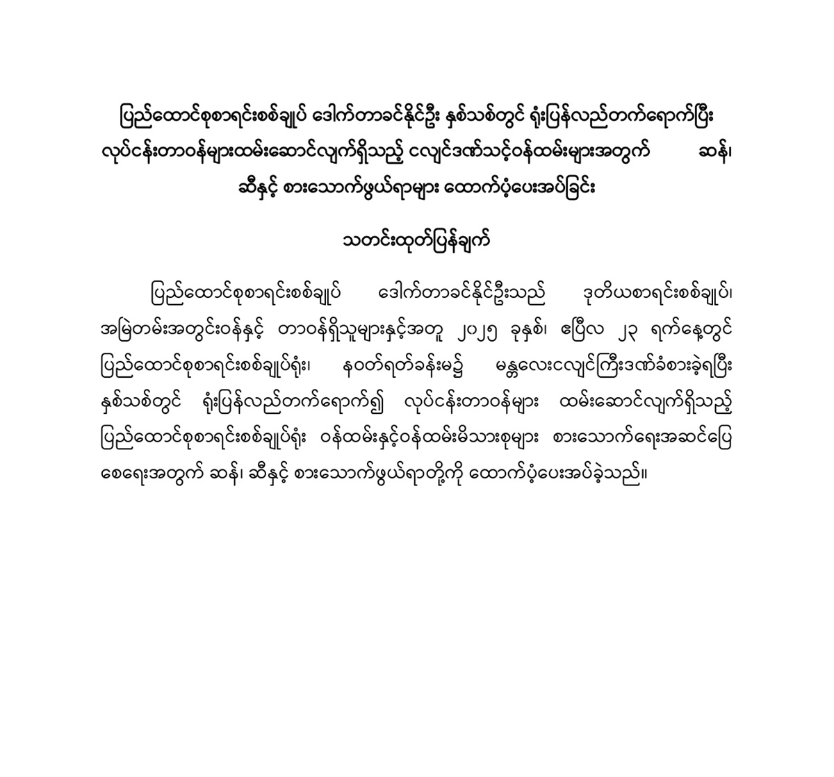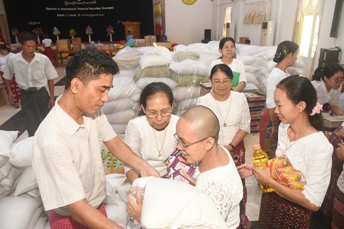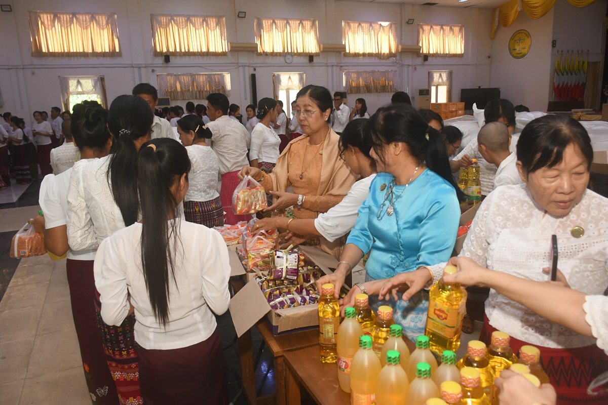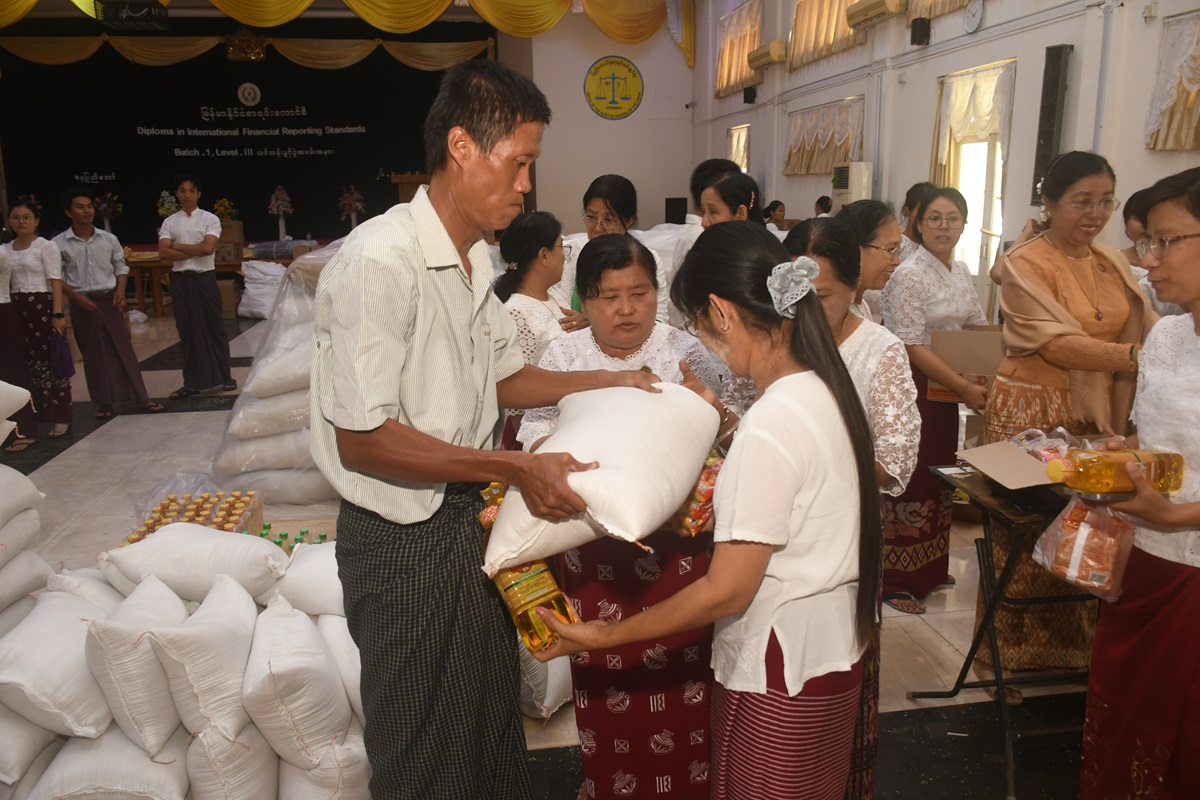 ပြည်ထောင်စုစာရင်းစစ်ချုပ် ဒေါက်တာခင်နိုင်ဦး နှစ်သစ်တွင် ရုံးပြန်လည်တက်ရောက်ပြီး လုပ်ငန်းတာဝန်များထမ်းဆောင်လျက်ရှိသည့် ငလျင်ဒဏ်သင့်ဝန်ထမ်းများအတွက် ဆန်၊ ဆီနှင့် စားသောက်ဖွယ်ရာများ ထောက်ပံ့ပေးအပ်ခြင်း