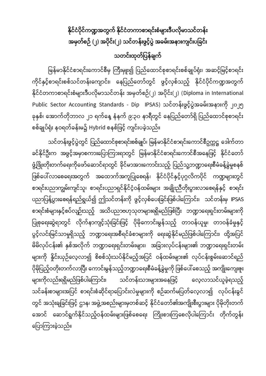 နိုင်ငံပိုင်ကဏ္ဍအတွက် နိုင်ငံတကာစာရင်းစံများဒီပလိုမာသင်တန်း အမှတ်စဉ် (၂) အပိုင်း(၂) သင်တန်းဖွင့်ပွဲ အခမ်းအနားကျင်းပခြင်း