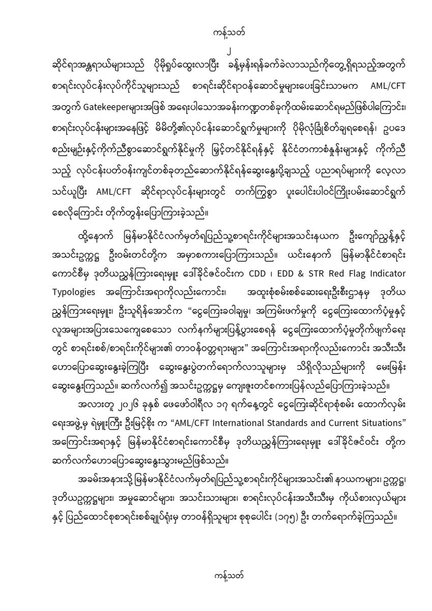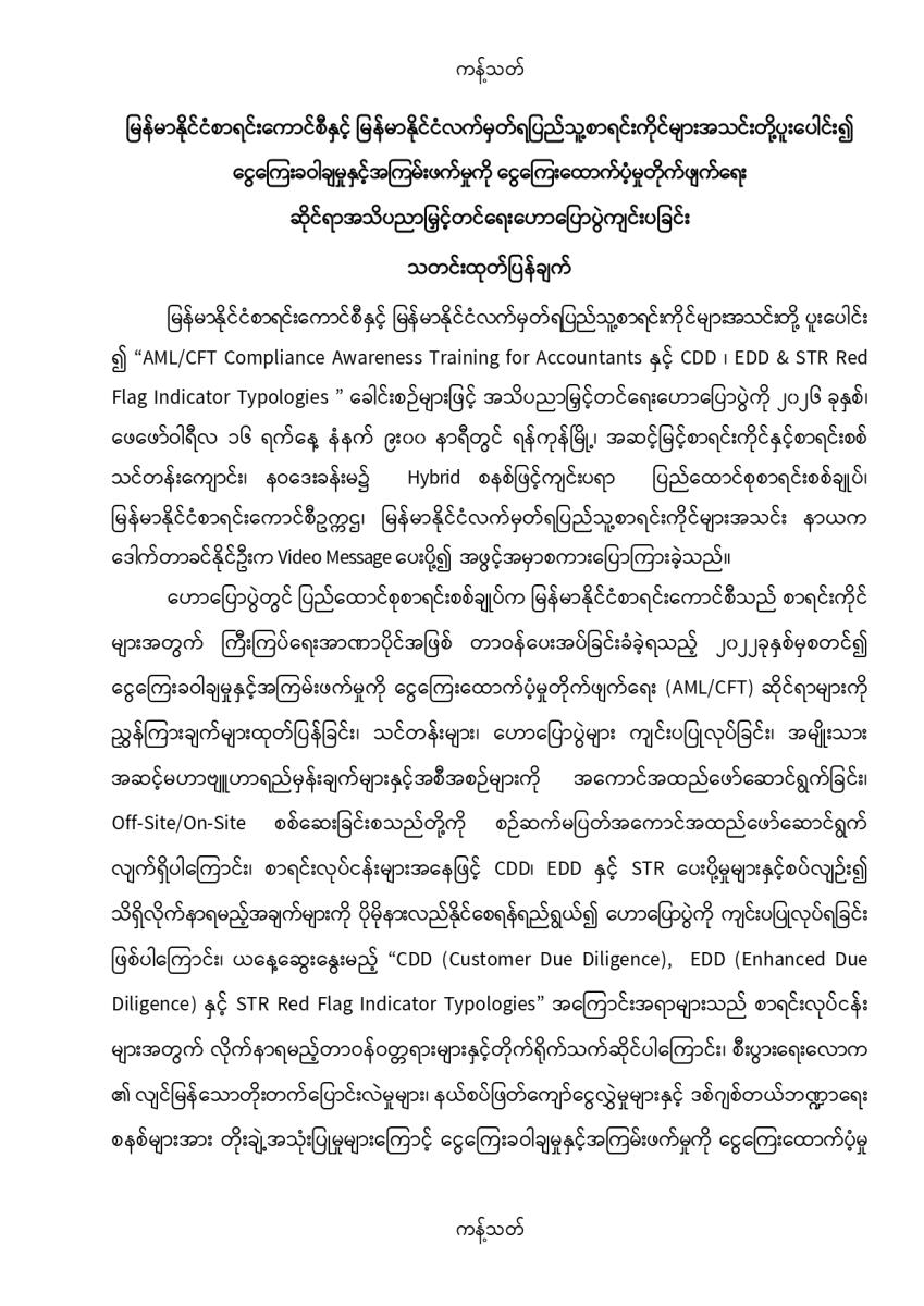 မြန်မာနိုင်ငံစာရင်းကောင်စီနှင့် မြန်မာနိုင်ငံလက်မှတ်ရပြည်သူ့စာရင်းကိုင်များအသင်းတို့ပူးပေါင်း၍ ငွေကြေးခဝါချမှုနှင့်အကြမ်းဖက်မှုကို ငွေကြေးထောက်ပံ့မှုတိုက်ဖျက်ရေး ဆိုင်ရာအသိပညာမြှင့်တင်ရေးဟောပြောပွဲကျင်းပခြင်း