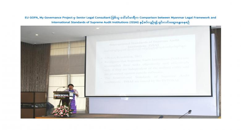 Firstly, the Auditor General of the Union delivered his opening speech. And then, Ms. Tora Jarlsby, Director General from the Office of the Auditor General of Norway discussed SAI Mandate and Independence: International Best Practices; Daw Naing Thet Oo, Permanent Secretary from OAGM presented the Practices of Union Auditor General Office and Challenges; Dr. Daw Khin Mar Yee, Senior Legal Consultant from My Governance Project presented Comparison between Myanmar Legal Framework and International Standards of Supreme Audit Institutions (ISSAI); there were recommendations of the participants, questions and answers after the presentations.
