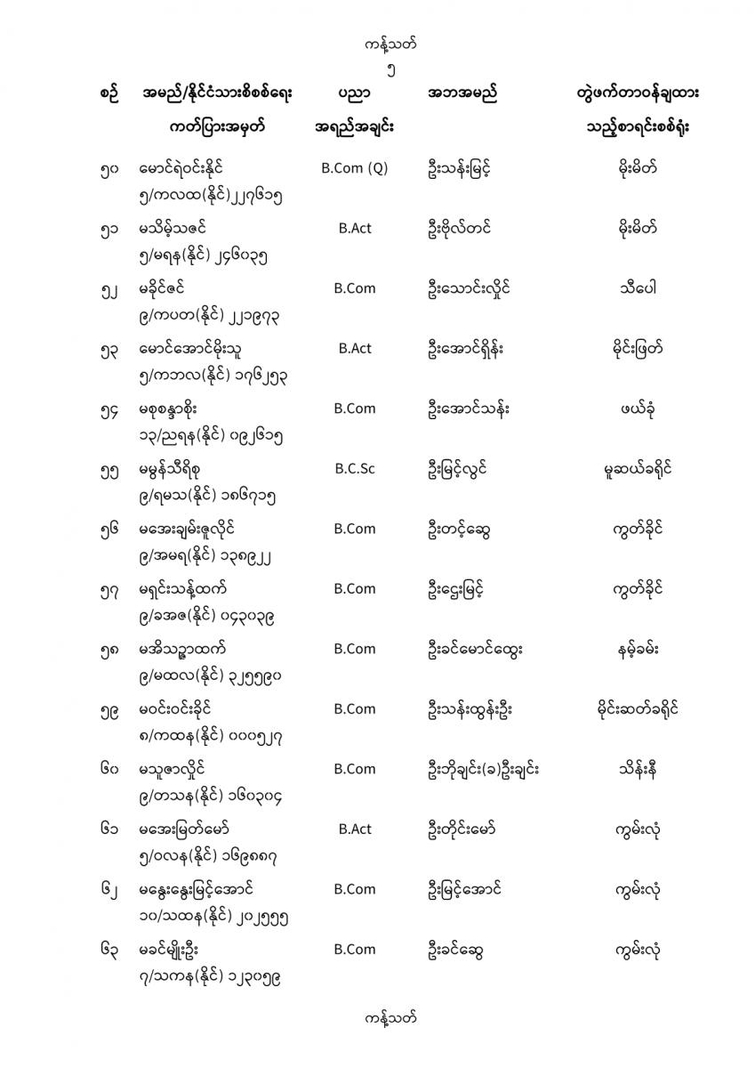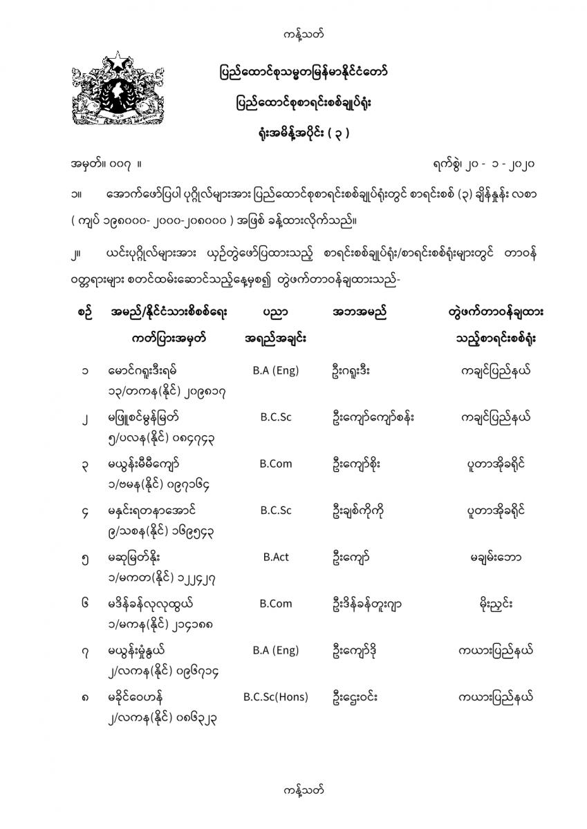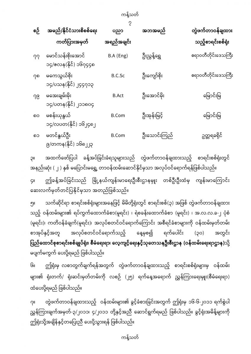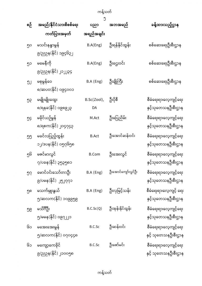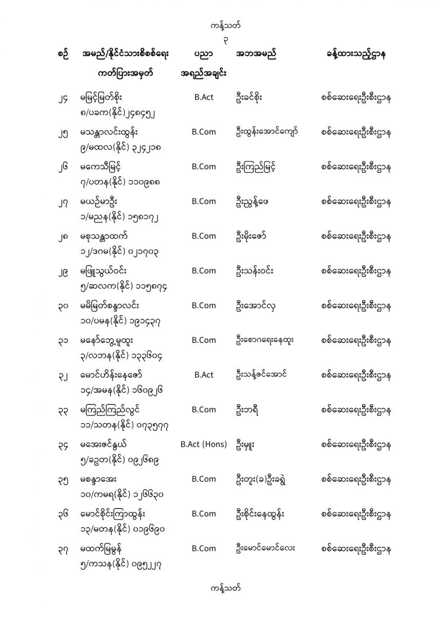 ပြည်ထောင်စုစာရင်းစစ်ချုပ်ရုံး၊ တိုင်းဒေသကြီး/ ပြည်နယ်စာရင်းစစ်ချုပ်ရုံးများနှင့် ဒေသစာရင်းစစ်ရုံးများတွင် စာရင်းစစ်(၃) ချိန်နှုန်းလစာ (ကျပ် ၁၉၈၀၀၀-၂၀၀၀-၂၀၈၀၀၀) ရာထူးအတွက် ဝန်ထမ်းသစ်များခန့်ထားခြင်း