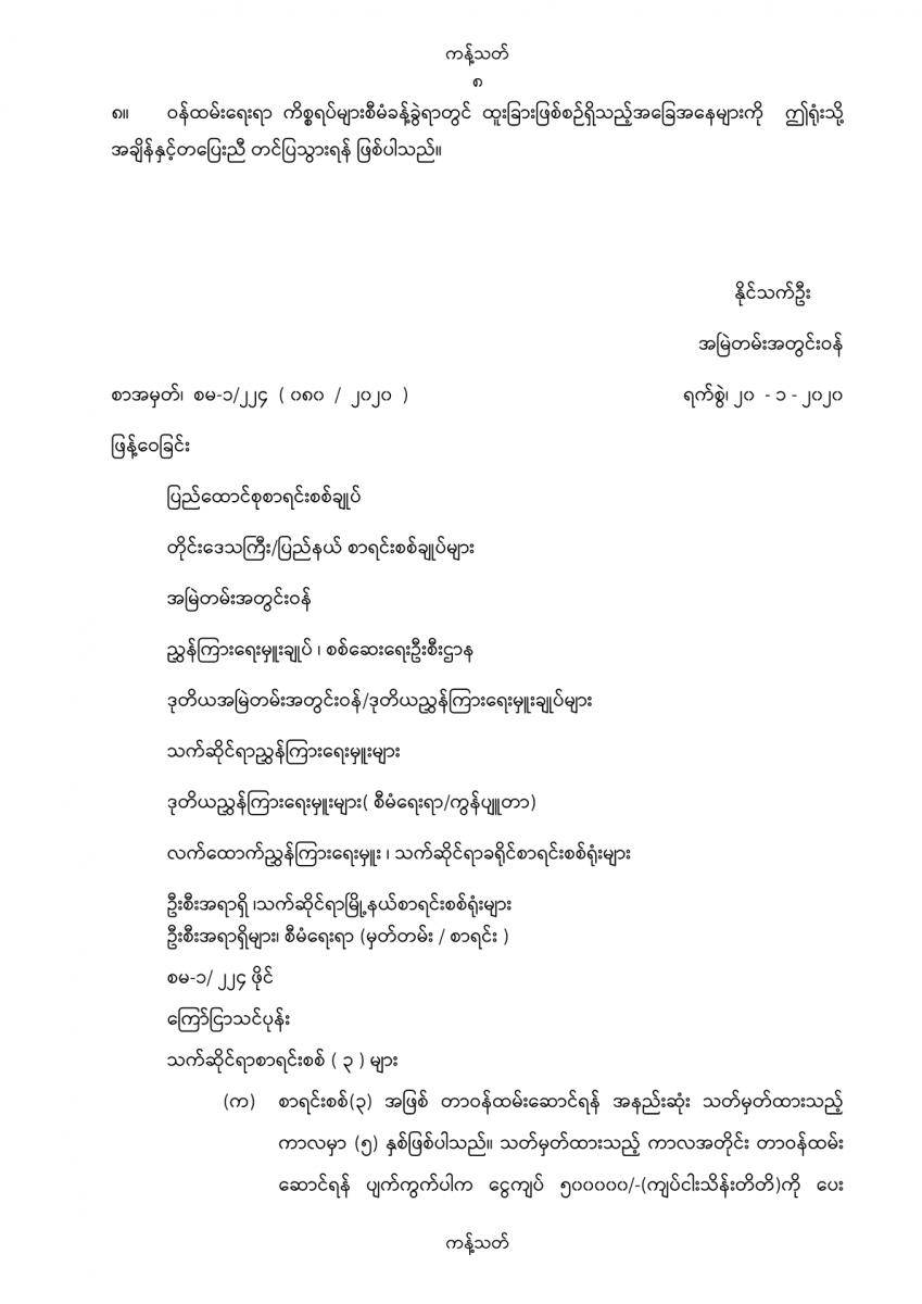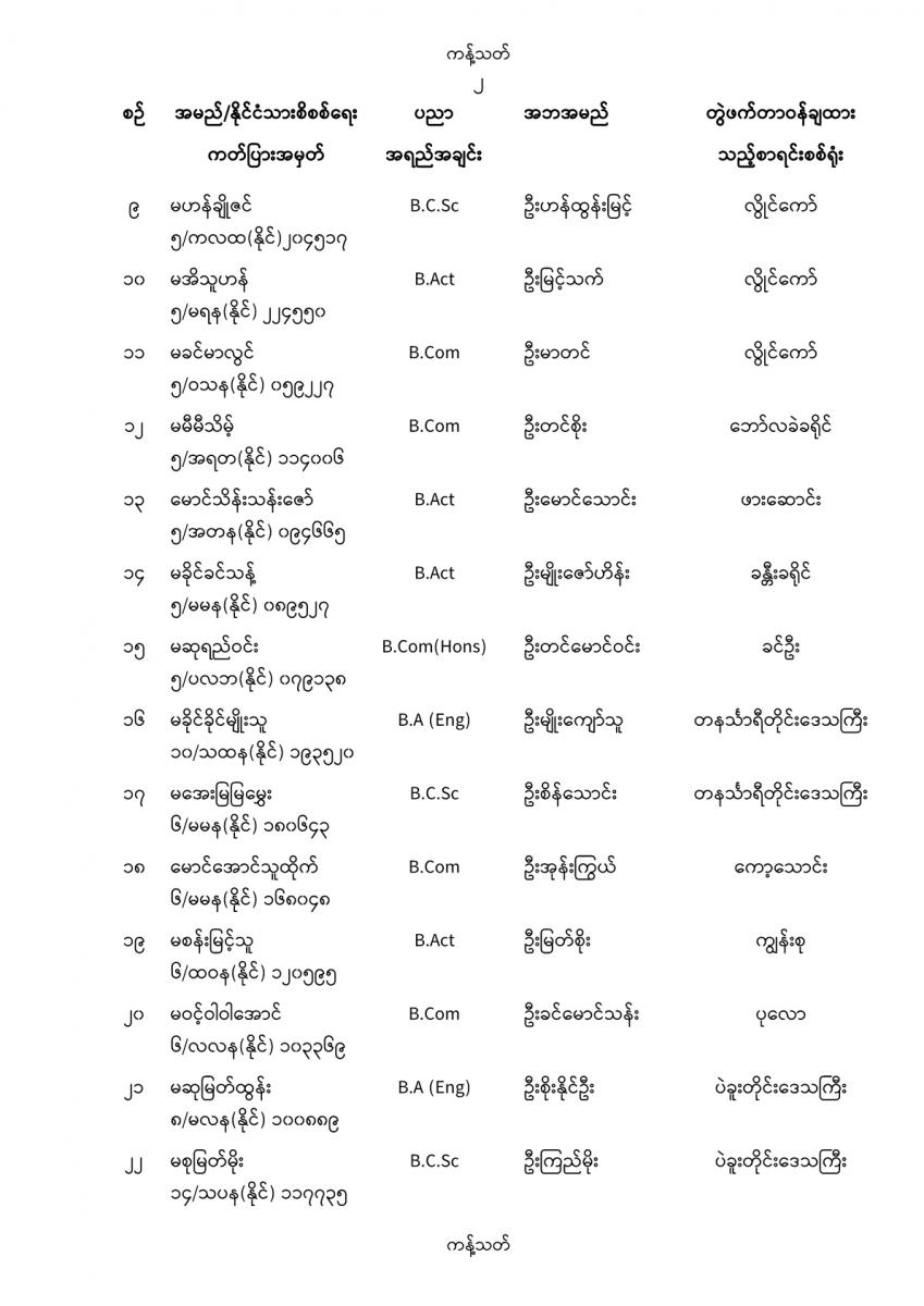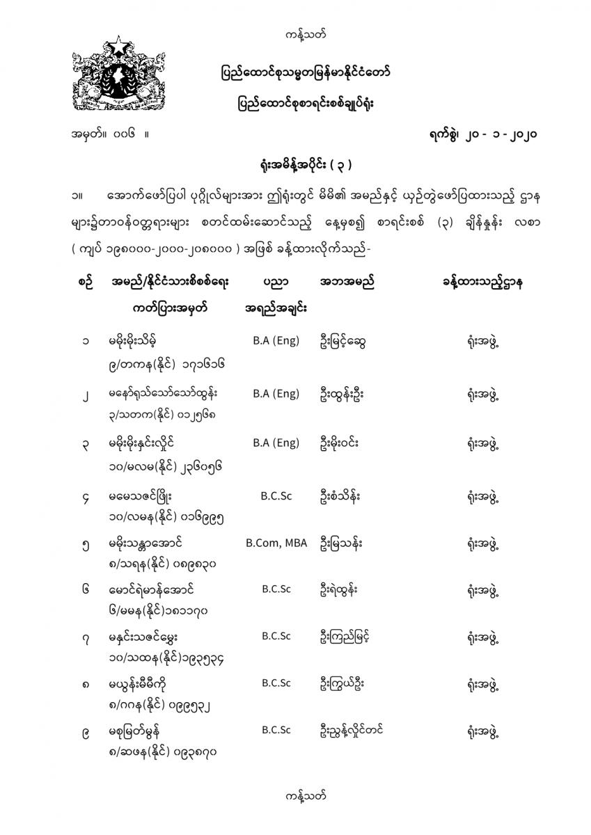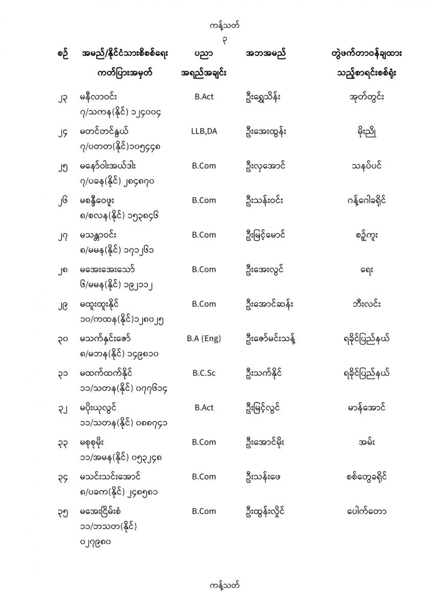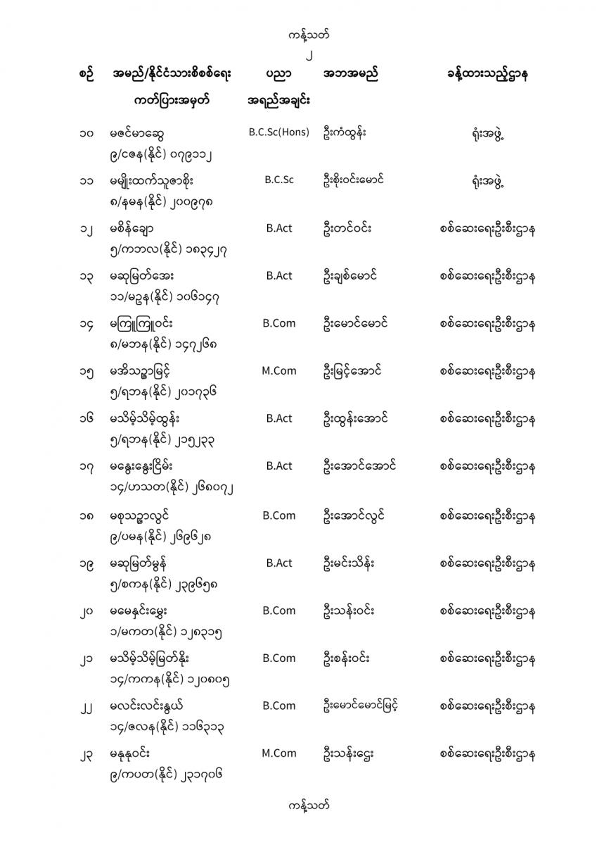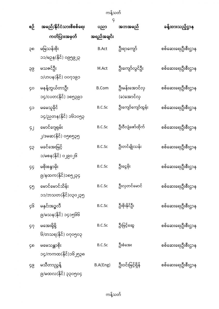 ပြည်ထောင်စုစာရင်းစစ်ချုပ်ရုံး၊ တိုင်းဒေသကြီး/ ပြည်နယ်စာရင်းစစ်ချုပ်ရုံးများနှင့် ဒေသစာရင်းစစ်ရုံးများတွင် စာရင်းစစ်(၃) ချိန်နှုန်းလစာ (ကျပ် ၁၉၈၀၀၀-၂၀၀၀-၂၀၈၀၀၀) ရာထူးအတွက် ဝန်ထမ်းသစ်များခန့်ထားခြင်း