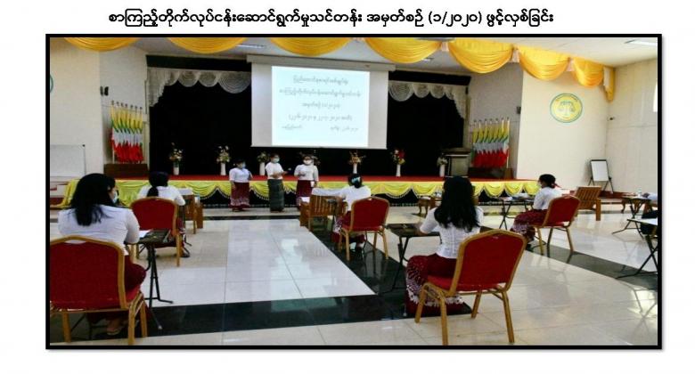 ပြည်ထောင်စုစာရင်းစစ်ချုပ်ရုံးရှိ ရုံးစာကြည့်တိုက်အား ဖွံ့ဖြိုးတိုးတက်စေရန်၊ စာကြည့်တိုက်လုပ်ငန်း ရေရှည်တည်တံ့ခိုင်မြဲစေရန်၊ စာဖတ်ခြင်းဖြင့် ဝန်ထမ်းများ၏ အတွေးအခေါ် အယူအဆများ မြင့်မားတိုးတက်စေရန် နှင့် စာကြည့်တိုက်လုပ်ငန်း ဆောင်ရွက်မှုများအား တတ်ကျွမ်းနားလည်ကြစေရန် ရည်ရွယ်ချက်ဖြင့် စာကြည့်တိုက်လုပ်ငန်းဆောင်ရွက်မှုသင်တန်း၊ အမှတ်စဉ်(၁/၂၀၂၀) ကို ပြည်ထောင်စုစာရင်းစစ်ချုပ်ရုံး၊ နေပြည်တော်ရှိ စုပေါင်းခန်းမ၌ ၂၂-၆-၂၀၂၀ ရက်နေ့မှစ၍ စတင်ဖွင့်လှစ်ခဲ့ ပါသည်။