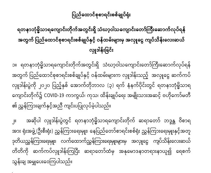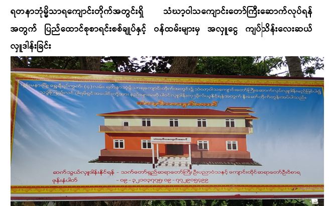 ရတနာဘုံမ္မိသာရကျောင်းတိုက်အတွင်းရှိ သံဃာ့ဝါသကျောင်းတော်ကြီးဆောက်လုပ်ရန်အတွက် ပြည်ထောင်စုစာရင်းစစ်ချုပ်နှင့်ဝန်ထမ်းများမှ အလှူငွေ ကျပ်သိန်းလေးဆယ် လှူဒါန်းခြင်း