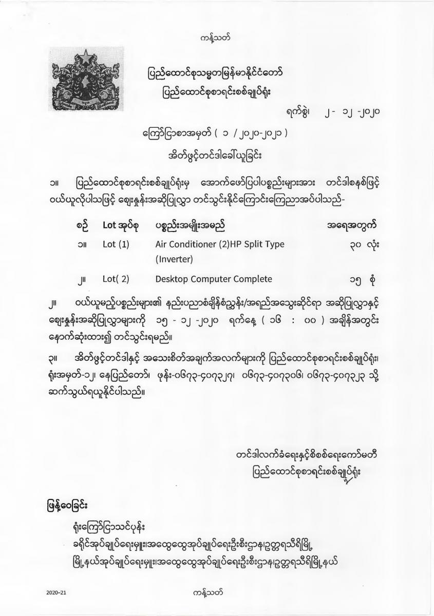 Air Conditioner (2) HP Split Type (Inverter) နှင့် Desktop Computer Complete အတွက် အိတ်ဖွင့်တင်ဒါခေါ်ယူခြင်း