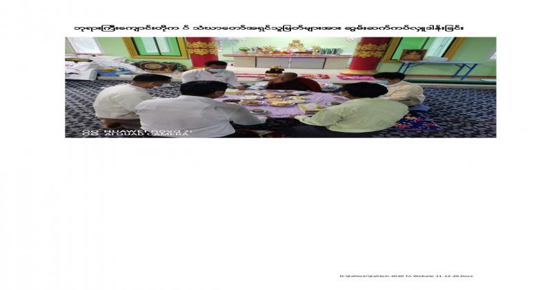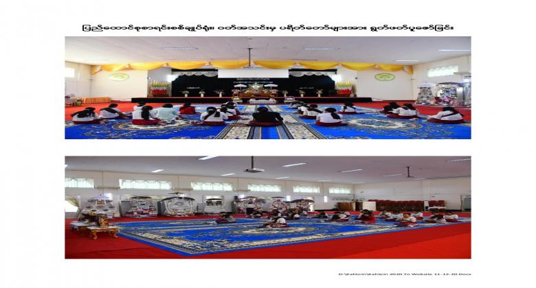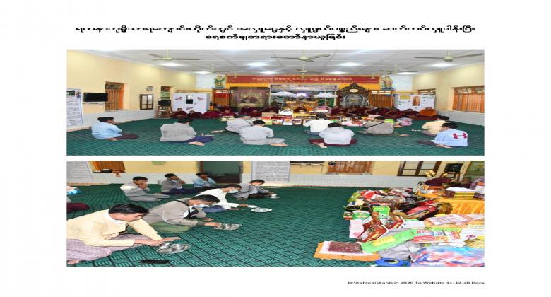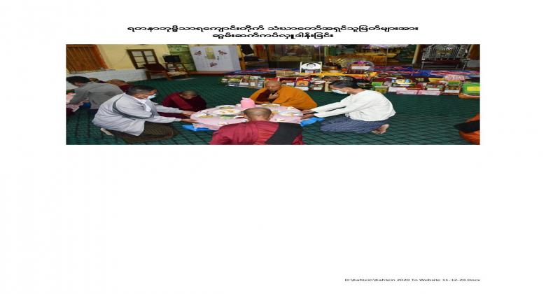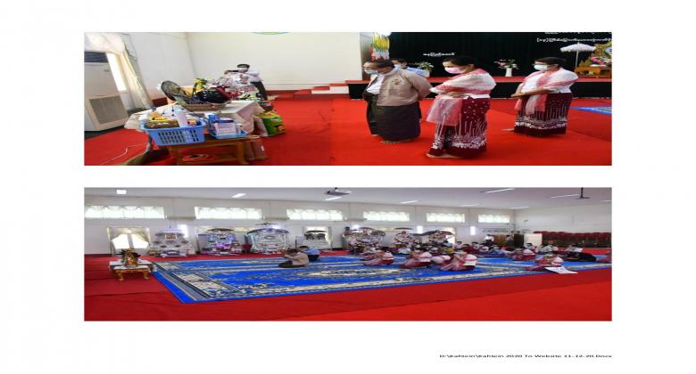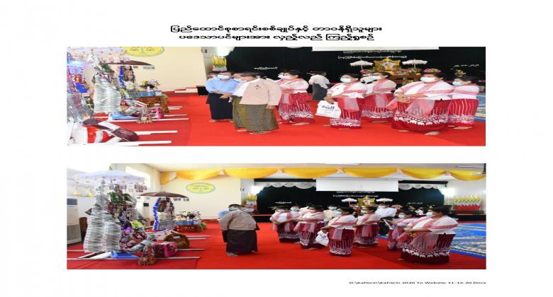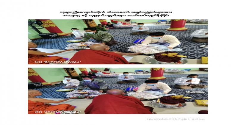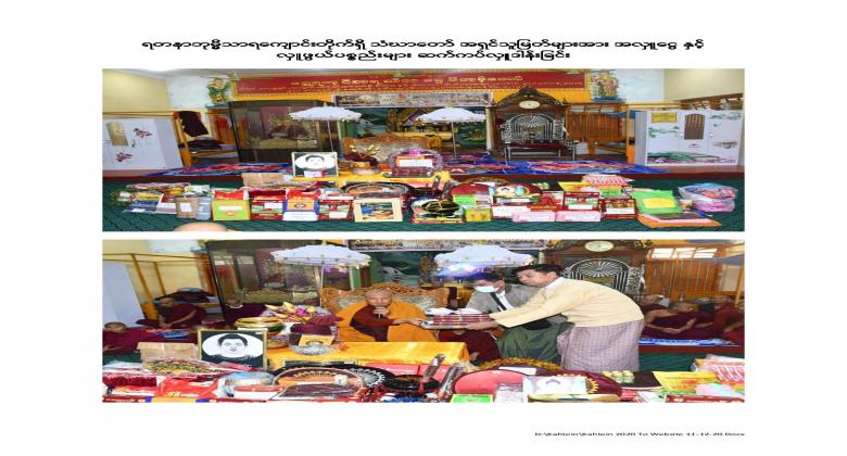 13th  Collective Maha Kathina donation ceremony of the Office of the Auditor General of the Union was held at the Bayargyi and the Yadanar Bhumithara monasteries on 26 November, 2020. Maha Kathina robe and offertories, kyats 4,999,600 in cash and worth kyats 2,441,450 in kind, totaling amount kyats 7,441,550 were offered to the monks. Venerable Sayadaws recited the Paritta Suttas, preached a sermon and merits for the donations made were shared.