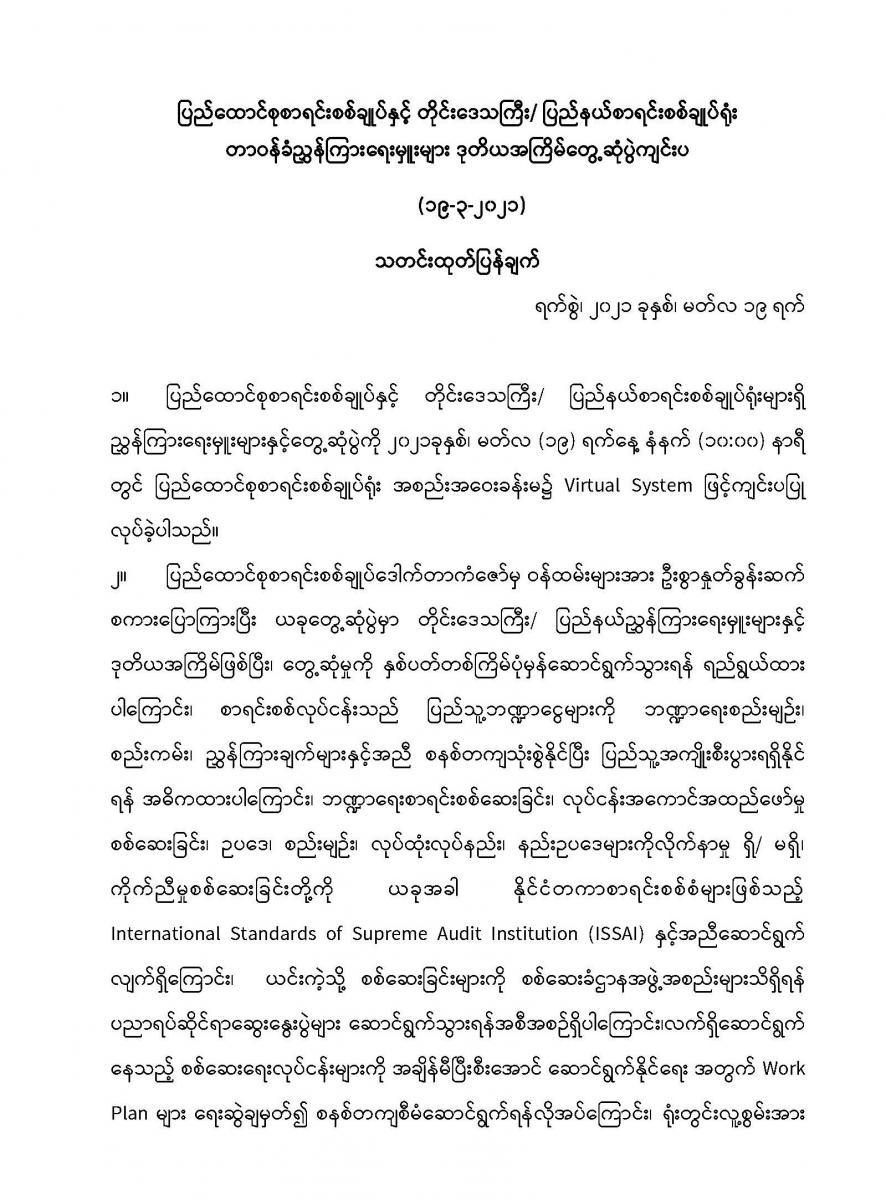 ၁၉-၃-၂၀၂၁ ရက်နေ့တွင် ပြည်ထောင်စုစာရင်းစစ်ချုပ်နှင့် တိုင်းဒေသကြီး/ ပြည်နယ်စာရင်းစစ်ချုပ်ရုံး တာဝန်ခံညွှန်ကြားရေးမှူးများ ဒုတိယအကြိမ်တွေ့ဆုံပွဲကျင်းပခြင်း