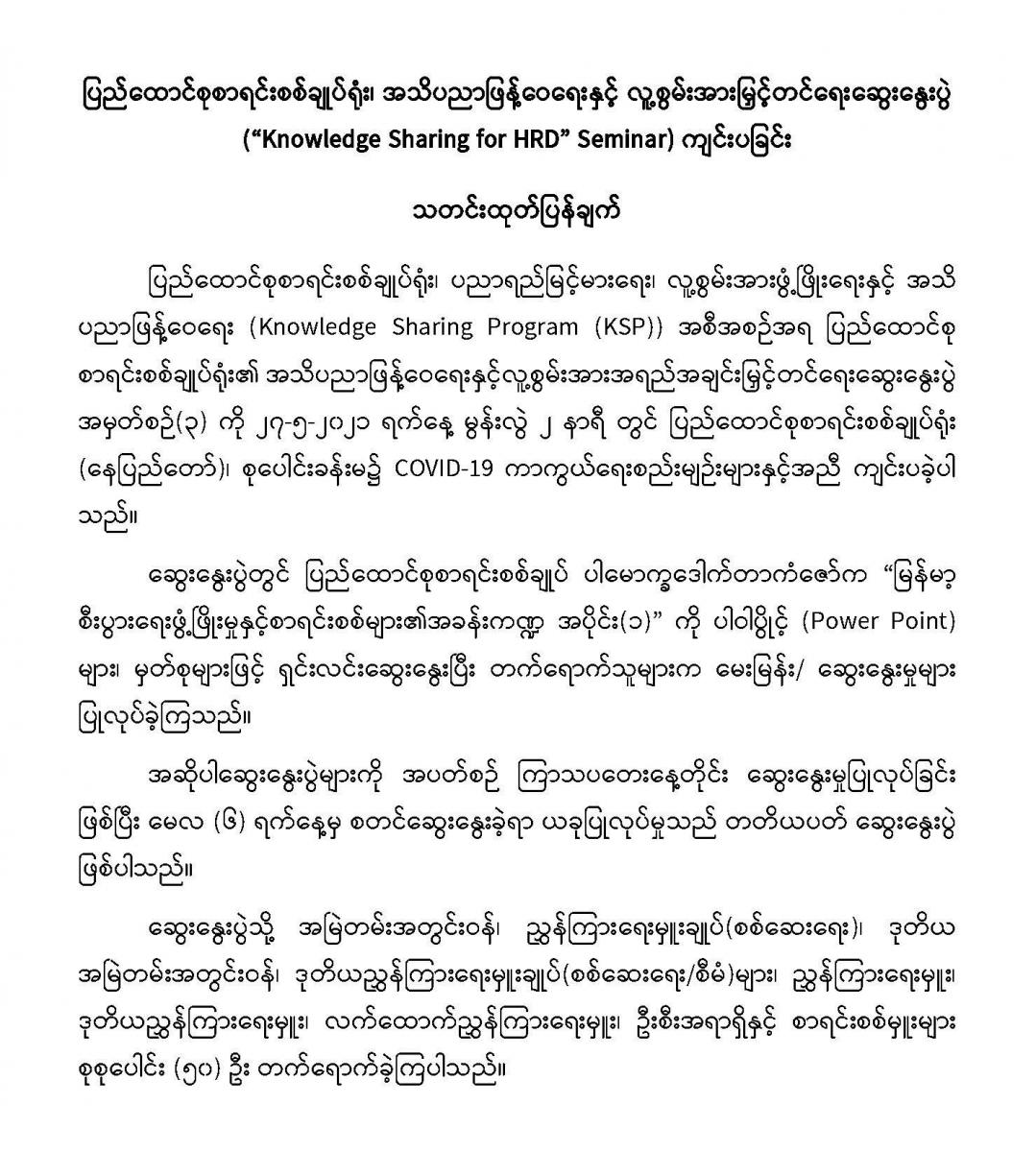၂၇-၅-၂၀၂၁ ရက်နေ့တွင် ပြည်ထောင်စုစာရင်းစစ်ချုပ်ရုံး၊ အသိပညာဖြန့်ဝေရေးနှင့် လူ့စွမ်းအားမြှင့်တင်ရေးဆွေးနွေးပွဲ (“Knowledge Sharing for HRD” Seminar) ကျင်းပခြင်း