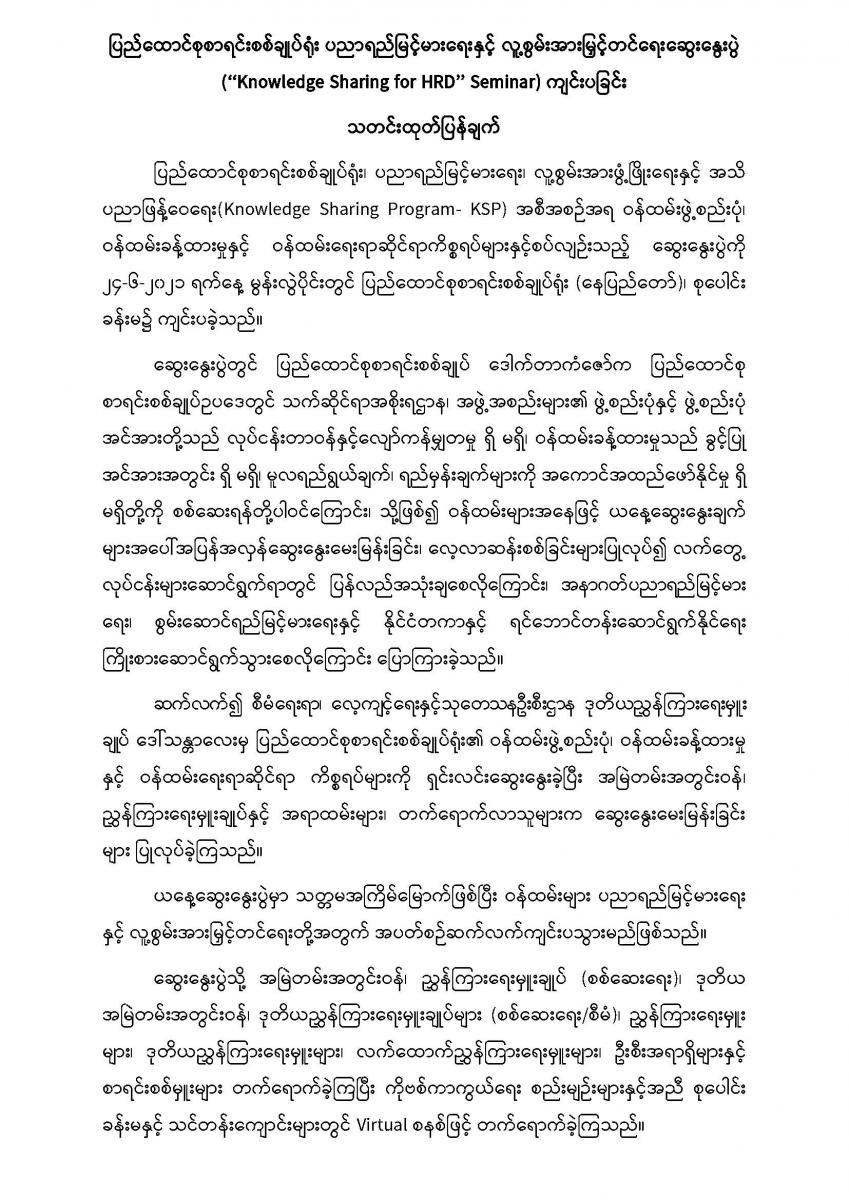 ၂၄-၆-၂၀၂၁ ရက်နေ့တွင် ပြည်ထောင်စုစာရင်းစစ်ချုပ်ရုံး ပညာရည်မြင့်မားရေးနှင့် လူ့စွမ်းအားမြှင့်တင်ရေးဆွေးနွေးပွဲ (‘‘Knowledge Sharing for HRD’’ Seminar) ကျင်းပခြင်း