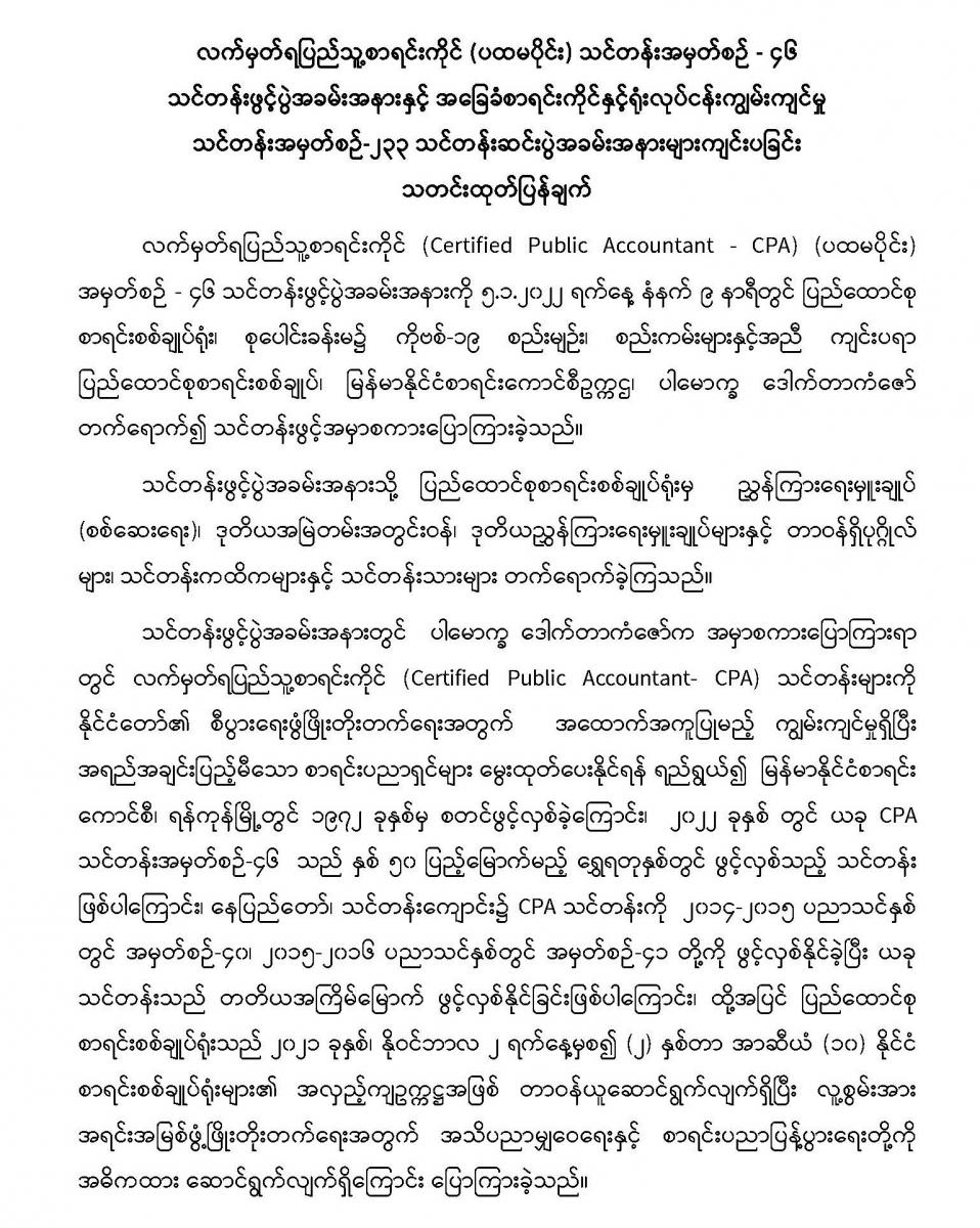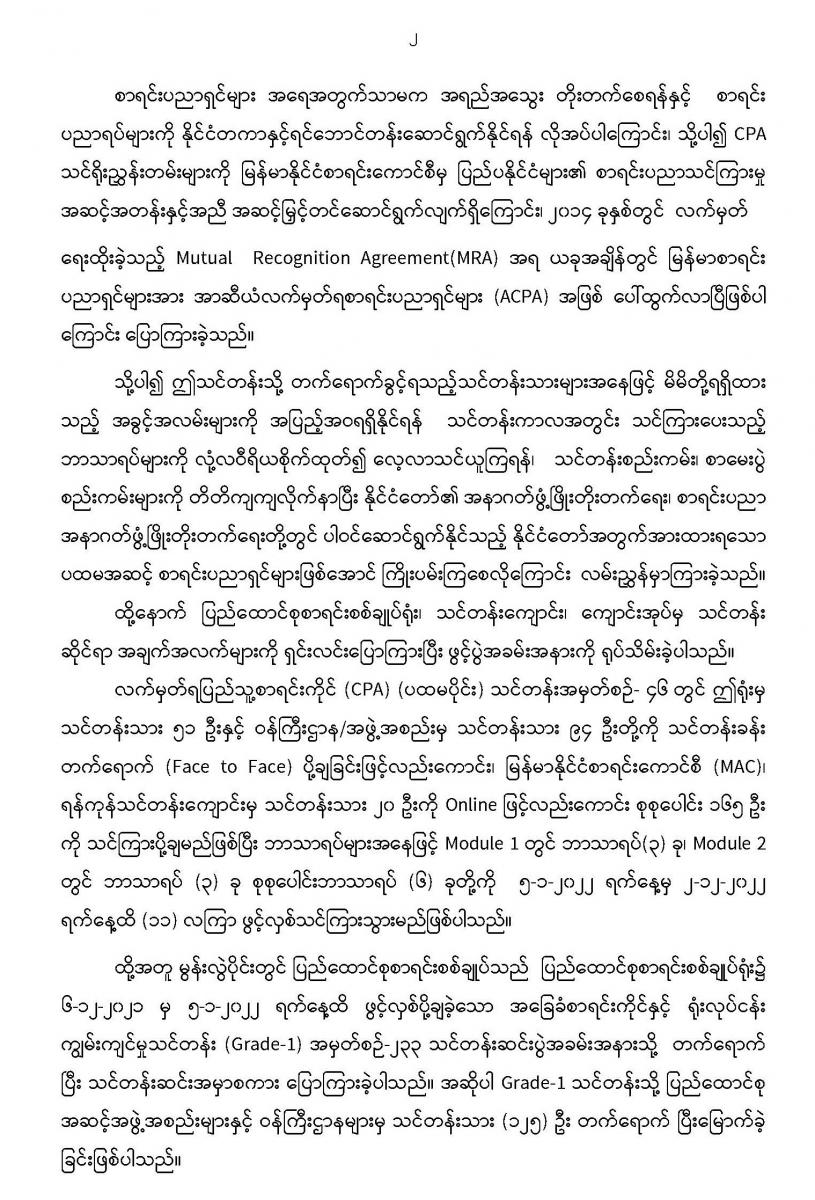 လက်မှတ်ရပြည်သူ့စာရင်းကိုင် (ပထမပိုင်း) သင်တန်းအမှတ်စဉ် - ၄၆ သင်တန်းဖွင့်ပွဲအခမ်းအနားနှင့် အခြေခံစာရင်းကိုင်နှင့်ရုံးလုပ်ငန်းကျွမ်းကျင်မှု သင်တန်းအမှတ်စဉ်-၂၃၃ သင်တန်းဆင်းပွဲအခမ်းအနားများကျင်းပခြင်း