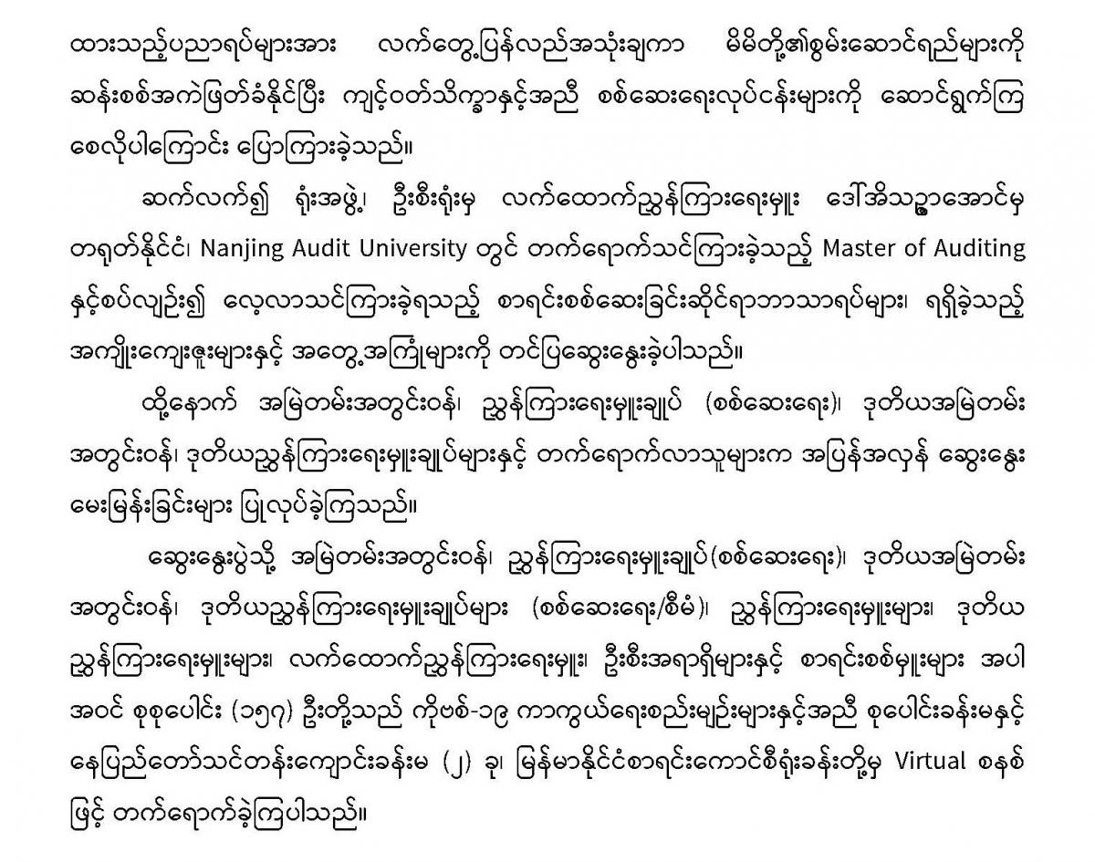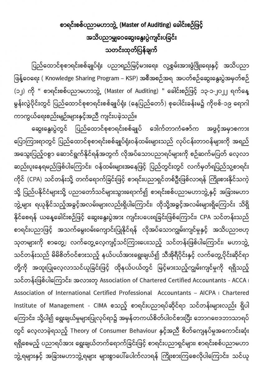 ၁၃-၁-၂၀၂၂ ရက်နေ့တွင် စာရင်းစစ်ပညာမဟာဘွဲ့ (Master of Auditing) ခေါင်းစဉ်ဖြင့် အသိပညာမျှဝေဆွေးနွေးပွဲကျင်းပခြင်း