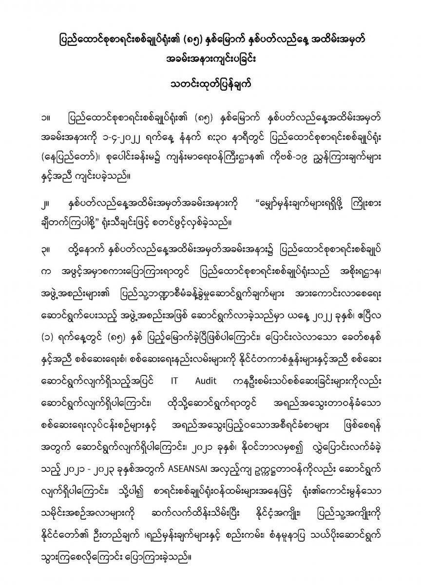 ၁-၄-၂၀၂၂ ရက်နေ့ ပြည်ထောင်စုစာရင်းစစ်ချုပ်ရုံး၏ (၈၅) နှစ်မြောက် နှစ်ပတ်လည်နေ့ အထိမ်းအမှတ် အခမ်းအနားကျင်းပခြင်း