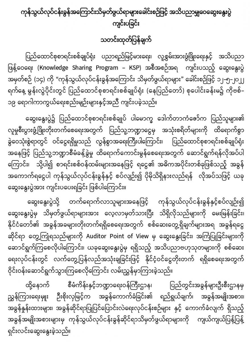 ၁၂-၅-၂၀၂၂ ရက်နေ့တွင် ကုန်သွယ်လုပ်ငန်းခွန်အကြောင်းသိမှတ်ဖွယ်ရာများခေါင်းစဉ်ဖြင့် အသိပညာမျှဝေဆွေးနွေးပွဲ ကျင်းပခြင်း