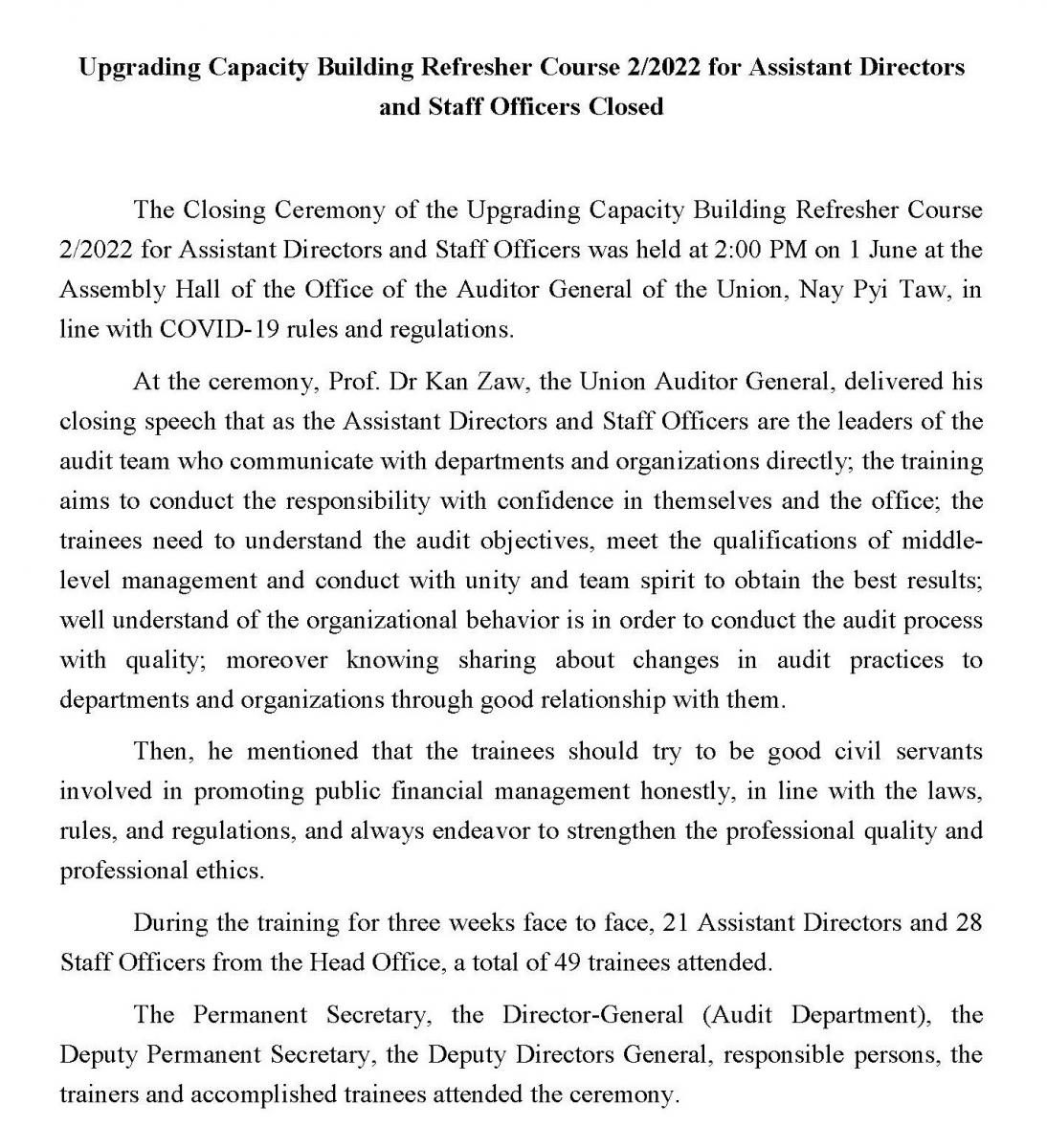Upgrading Capacity Building Refresher Course 2/2022 for Assistant Directors and Staff Officers Closed