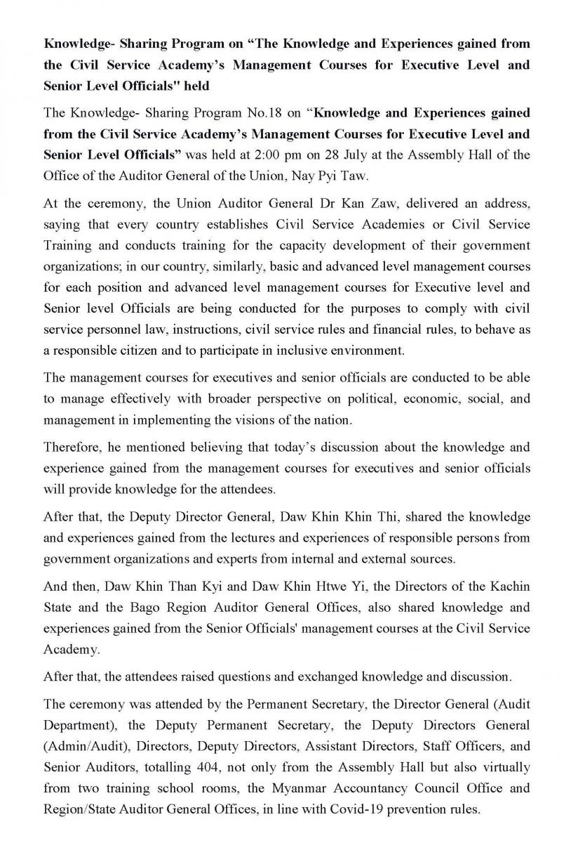 Knowledge- Sharing Program on “The Knowledge and Experiences gained from the Civil Service Academy’s Management Courses for Executive Level and Senior Level Officials" held