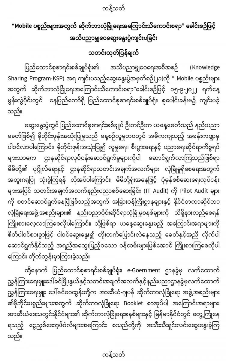 ၁၅-၉-၂၀၂၂ ရက်နေ့တွင် “Mobile ပစ္စည်းများအတွက် ဆိုက်ဘာလုံခြုံရေးအကြောင်းသိကောင်းစရာ” ခေါင်းစဉ်ဖြင့် အသိပညာမျှဝေဆွေးနွေးပွဲကျင်းပခြင်း