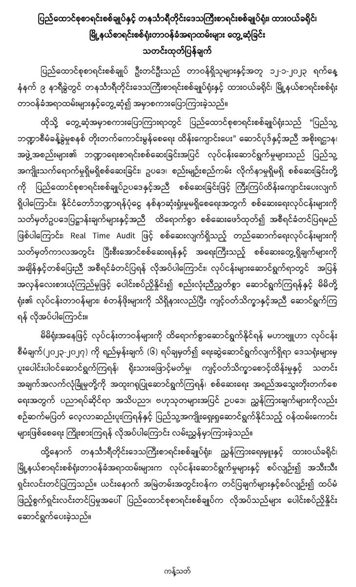 ၁၂-၁-၂၀၂၃ ရက်နေ့တွင် ပြည်ထောင်စုစာရင်းစစ်ချုပ်နှင့် တနင်္သာရီတိုင်းဒေသကြီးစာရင်းစစ်ချုပ်ရုံး၊ ထားဝယ်ခရိုင်၊ မြို့နယ်စာရင်းစစ်ရုံးတာဝန်ခံအရာထမ်းများ တွေ့ဆုံခြင်း