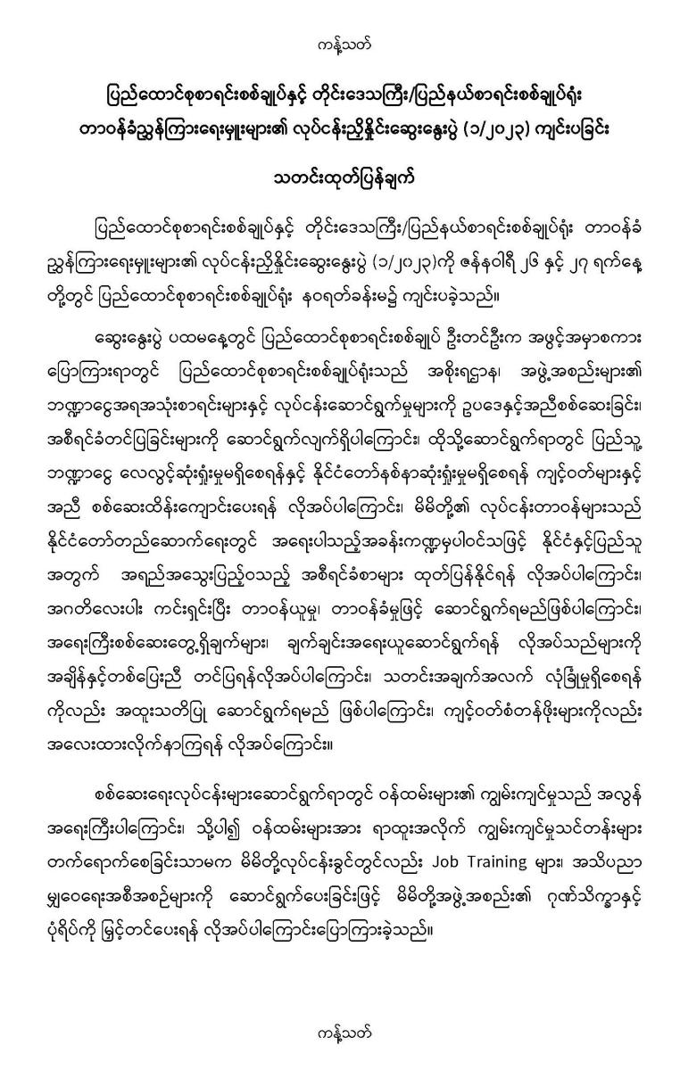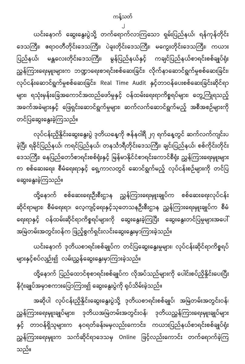 ၂၆-၁-၂၀၂၃ ရက်နေ့နှင့် ၂၇-၁-၂၀၂၃ ရက်နေ့တို့တွင် ပြည်ထောင်စုစာရင်းစစ်ချုပ်နှင့် တိုင်းဒေသကြီး/ ပြည်နယ်စာရင်းစစ်ချုပ်ရုံး တာဝန်ခံညွှန်ကြားရေးမှူးများ၏ လုပ်ငန်းညှိနှိုင်းဆွေးနွေးပွဲ (၁/၂၀၂၃) ကျင်းပခြင်း
