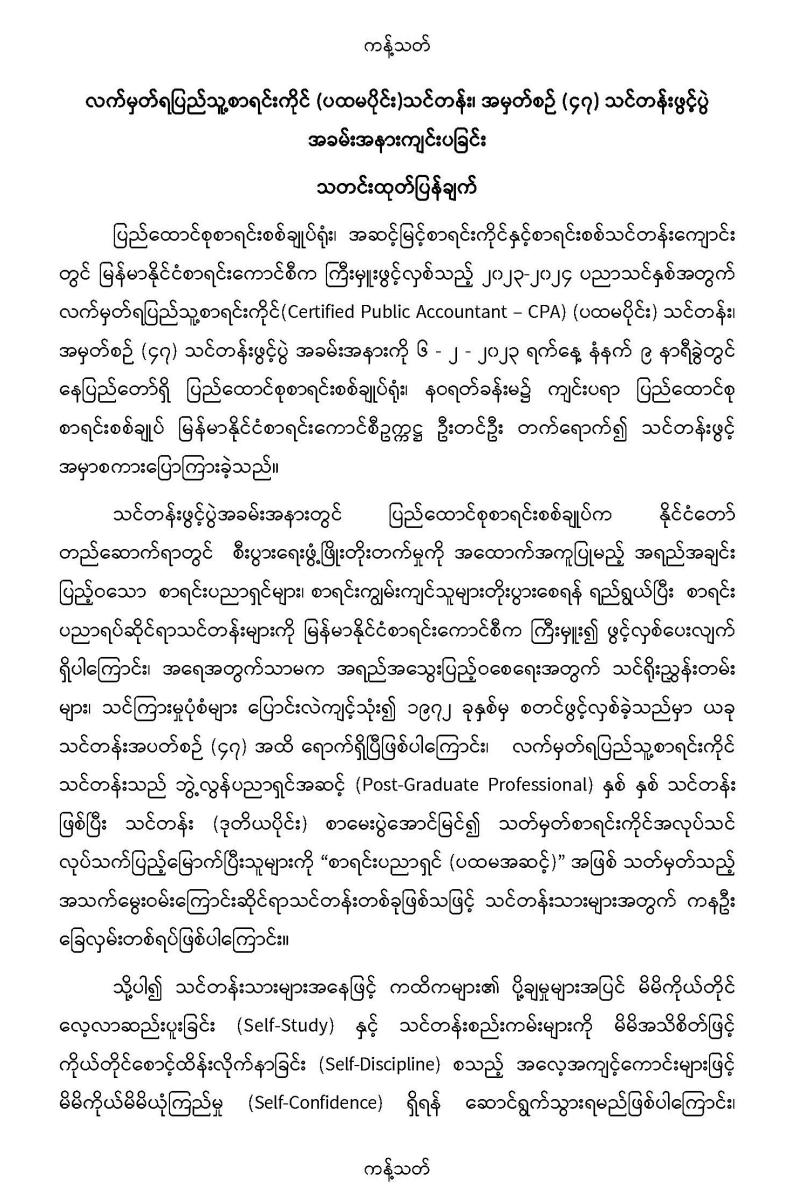 ၆-၂-၂၀၂၃ ရက်နေ့တွင် လက်မှတ်ရပြည်သူ့စာရင်းကိုင် (ပထမပိုင်း) သင်တန်း၊ အမှတ်စဉ် (၄၇) သင်တန်းဖွင့်ပွဲအခမ်းအနားကျင်းပခြင်း