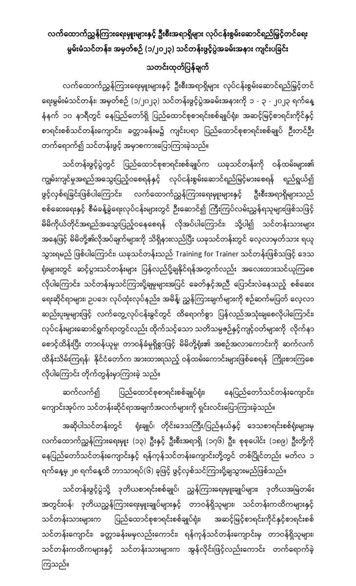 ၁-၃-၂၀၂၃ ရက်နေ့တွင် လက်ထောက်ညွှန်ကြားရေးမှူးများနှင့် ဦးစီးအရာရှိများ လုပ်ငန်းစွမ်းဆောင်ရည်မြှင့်တင်ရေး မွမ်းမံသင်တန်း၊ အမှတ်စဉ် (၁/၂၀၂၃) သင်တန်းဖွင့်ပွဲအခမ်းအနား ကျင်းပခြင်း
